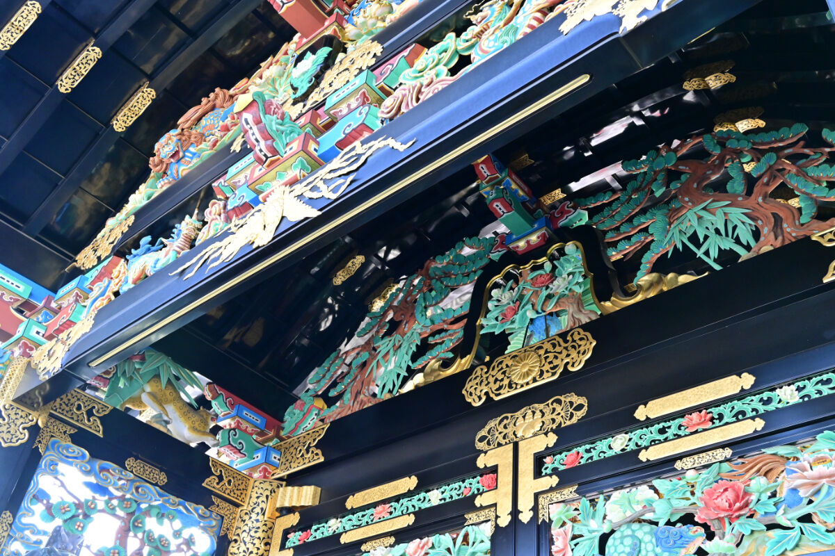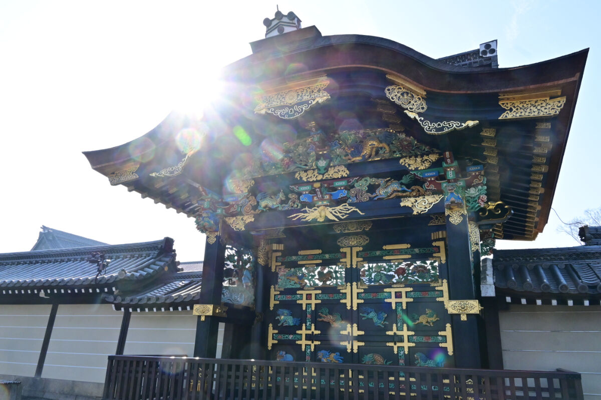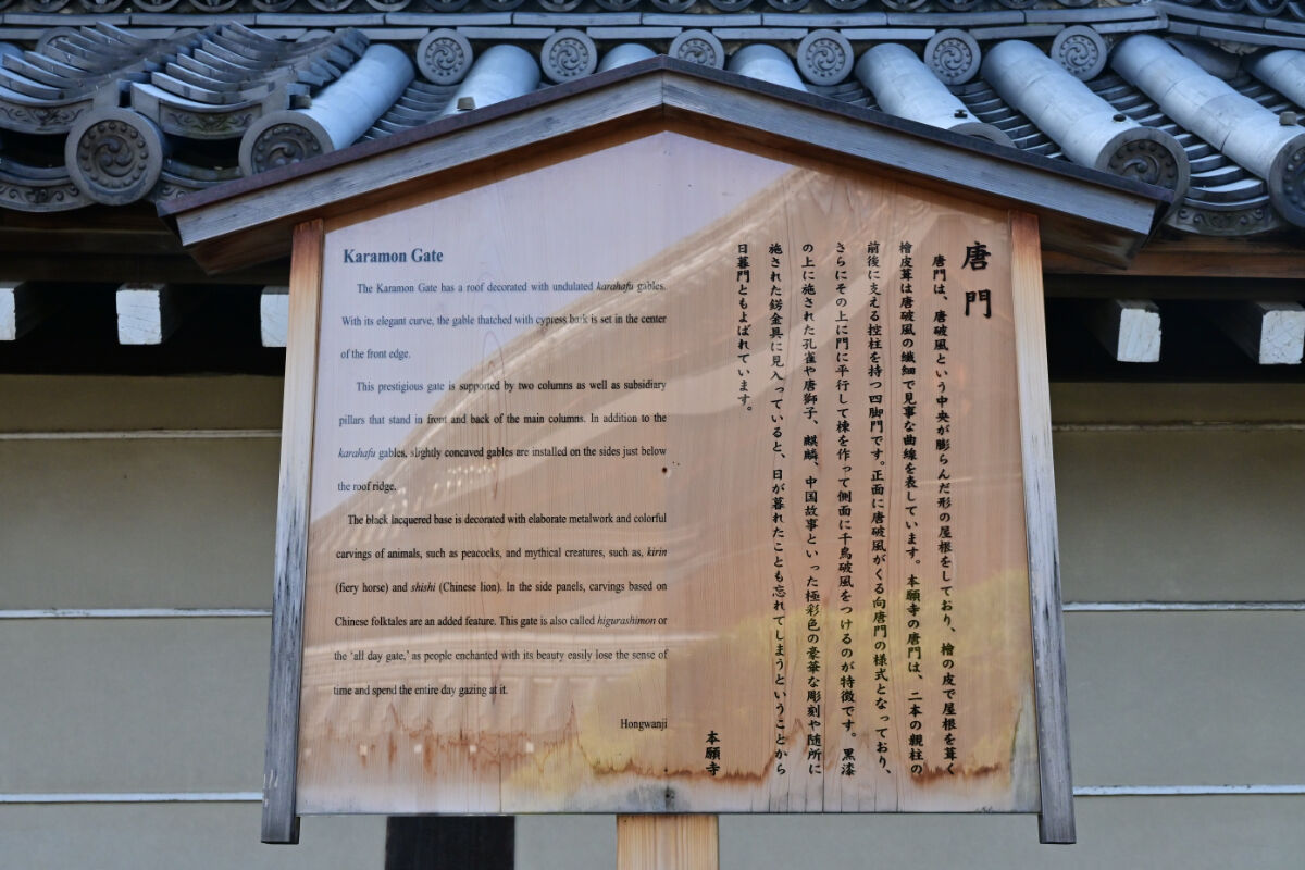 西本願寺の国宝である唐門は,見ていると日が暮れるのも忘れてしまうことから,日暮門(ひぐらしもん)ともよばれます。桃山時代の豪華な装飾美を今に伝える貴重な遺構。細部まで彫り込まれた極彩色の彫刻が特徴で,牡丹,唐獅子,鶴,龍など縁起のよいモチーフが施されています。