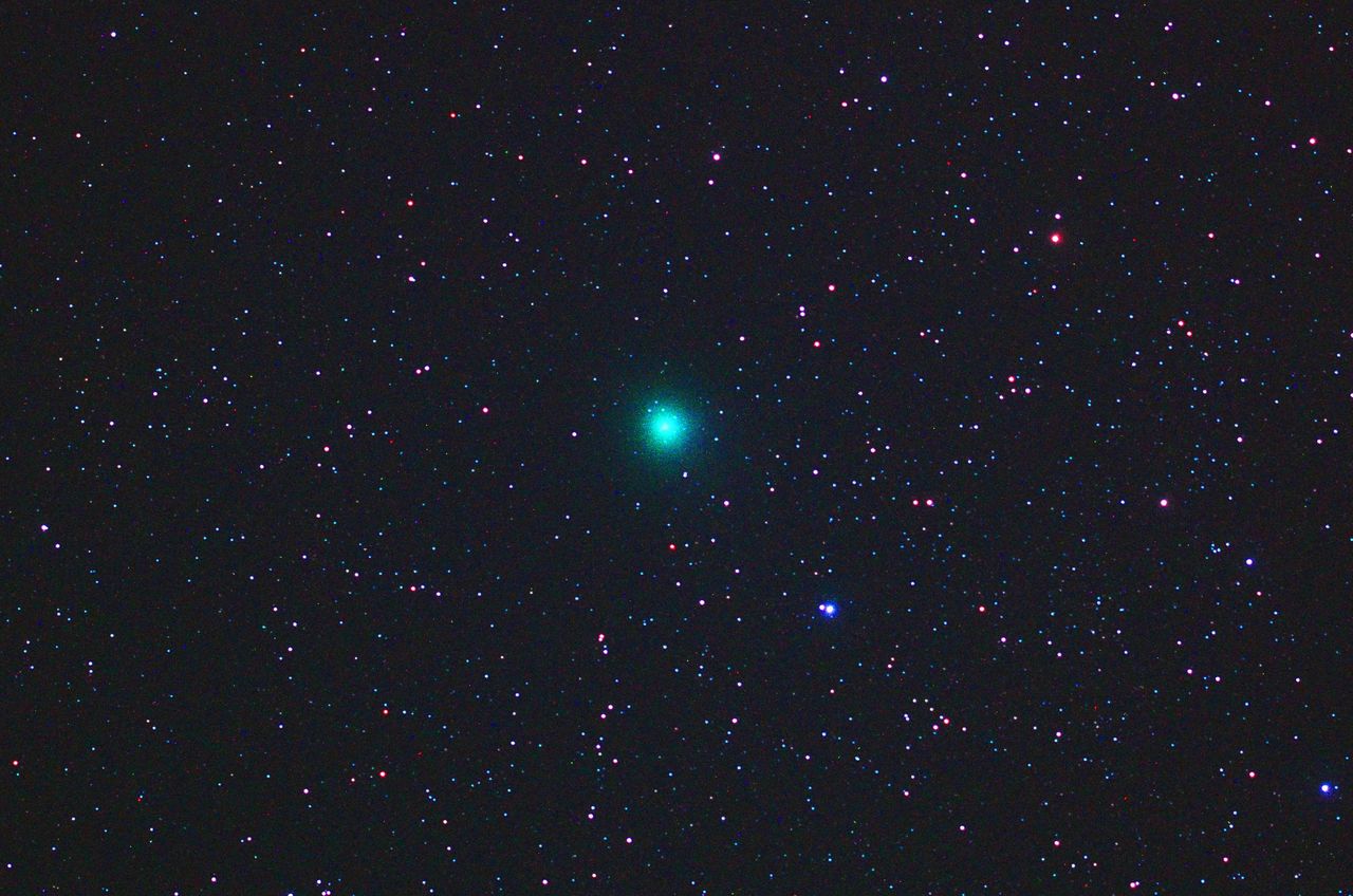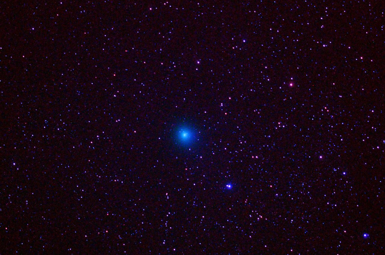 尾は地球から見てちょうど彗星の向こう側にあるので,残念ながらほとんど見えないのですが,そのかわり,地球と太陽の距離の半分まで近づいているので,大きくてしかも動きがとても速くて,見ている間に星の間を動いていきます。