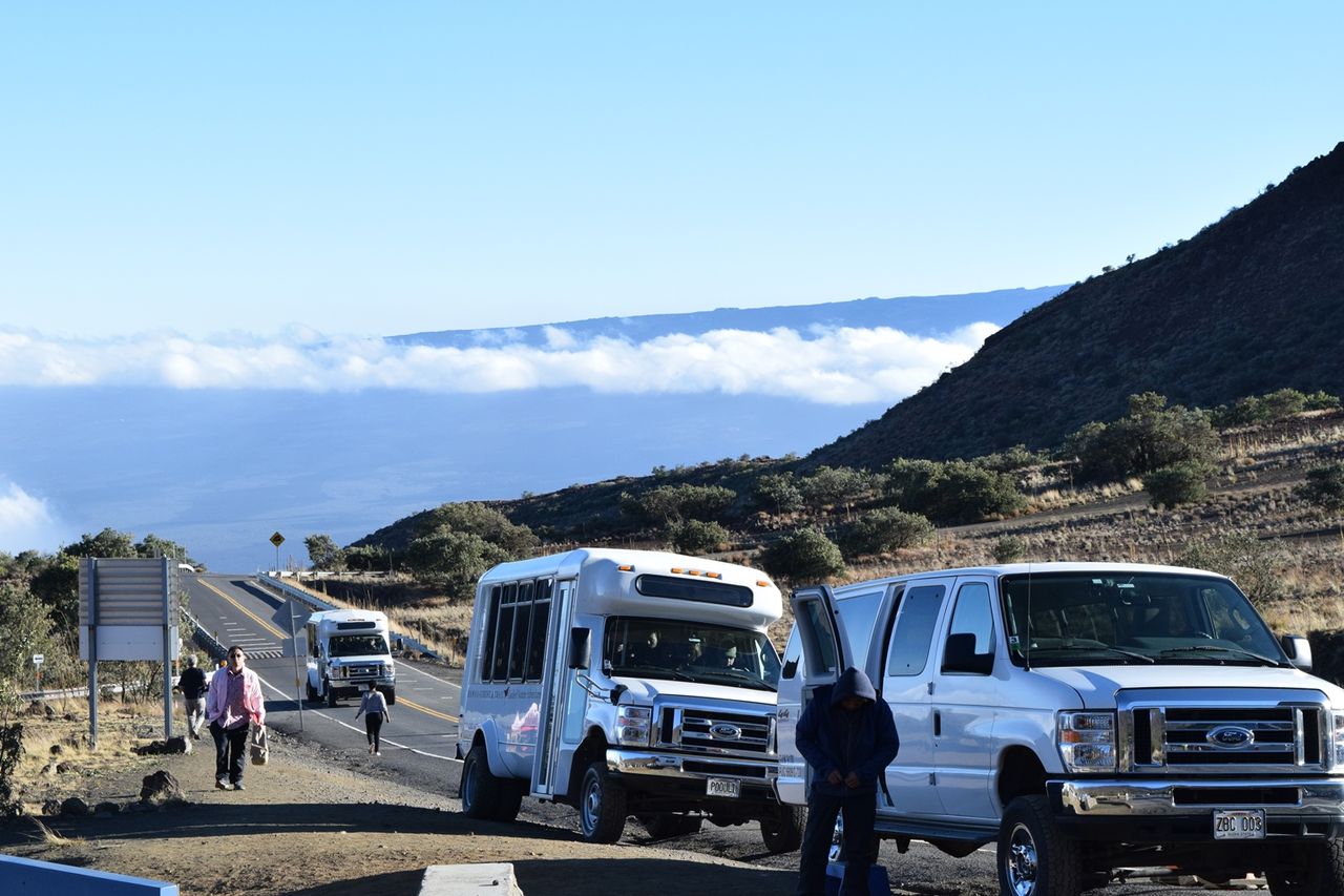 午後1時,ホテルのロビーで待っていたら,日本語を話すアメリカ人の若者が現れた。彼がこのツアーのドライバ兼ガイドであった。あいさつの後で切り出されたのが,今日はマウナケアの山頂は強風で,ビジターセンターまでは行けるがその先が閉鎖されている,ということであった。ただし,天候は回復基調で,閉鎖は解けるかもしれない,ということであった。そして,そういう条件でよければ,このツアーに参加してください,と言われて,書類にサインを求められた。