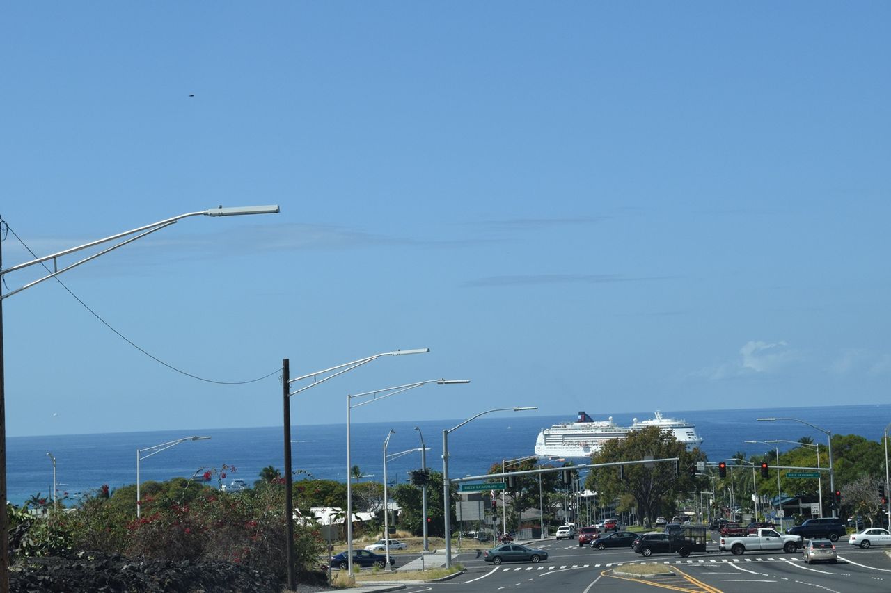 日本と違って信号も渋滞もない道路を時速100キロメートル近くの速度で走って30分以上ということなので,ずいぶんと距離があった。やっと周りに住宅街が見えてきたころに,道路はだんだんと坂を下り始めて,眼下には美しい海と大きな旅客船が見えてきた。
