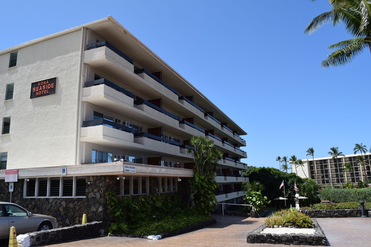 それを越えると,大きなショッピングセンターやレストランなどがあった。街路樹はヤシの木であった。さらに海岸に向かって走って行くと,道路は行きどまり,いや,直進方法は狭くなって,広い道路が左右に曲がるT字路のような感じの交差点になった。その交差点の左側前方にあったのが,私が今日から5日間宿泊する「コナ・シーサイド・ホテル」(Kona Seaside Hotel)であった。