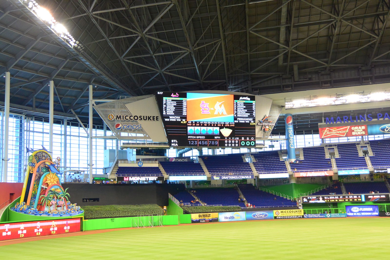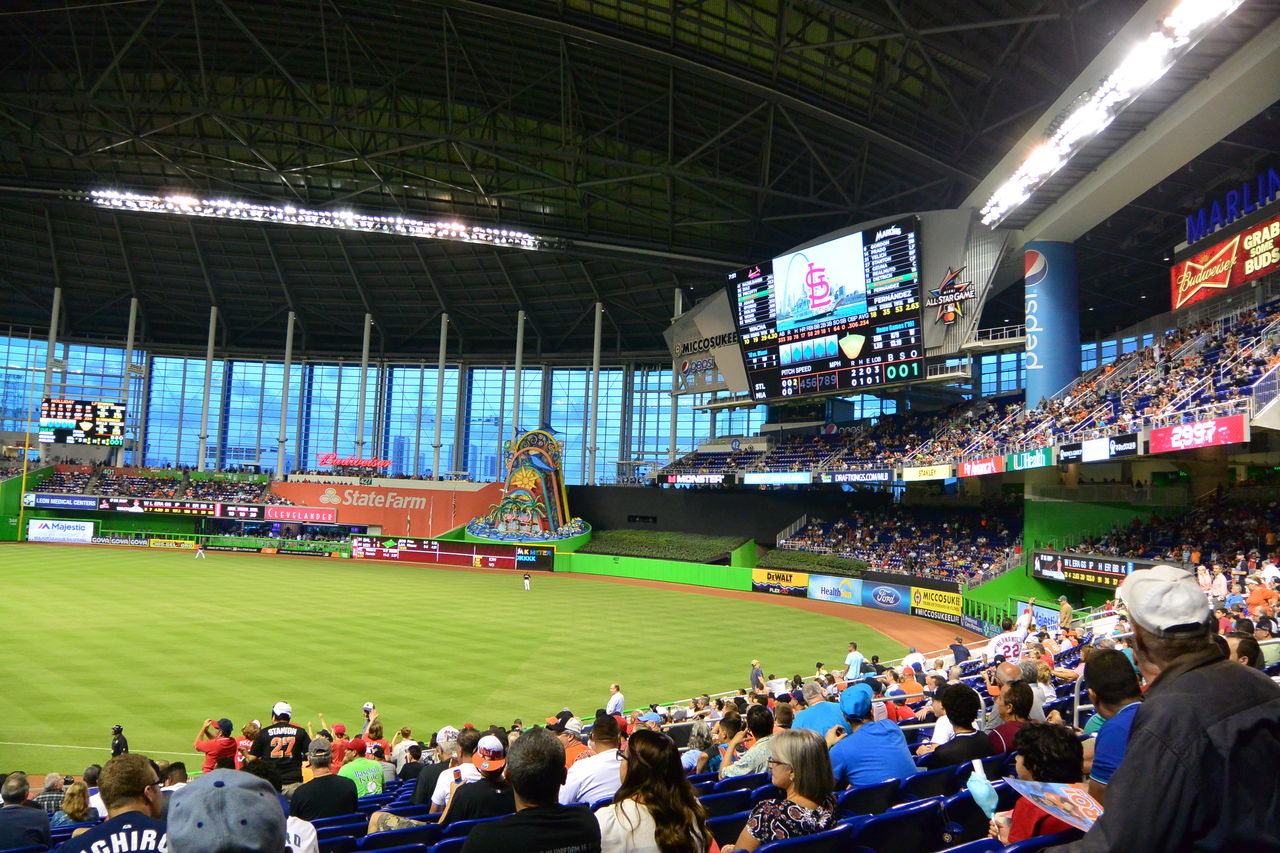 来てみてわかったのは,このマイアミ・マーリンズのボールパークは,まったく不人気なところということであった。こんなに話題の豊富なゲームであっても客席はガラガラだったから,前売りのチケットなど買う必要もなかったのだ。