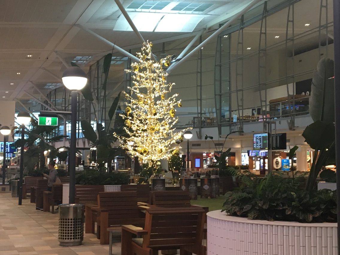 ブリスベンの空港は広く新しく,中央に大きなクリスマスツリーがそびえ,そのまわりにフードコートやお店がありました。アメリカに比べたら人はすごく少ないし,のんびりしています。待ち時間が2時間あまり。機内でわずかばかりの朝食は食べたのですが,再び空港で朝食をとろうかどうしようか思案しました。