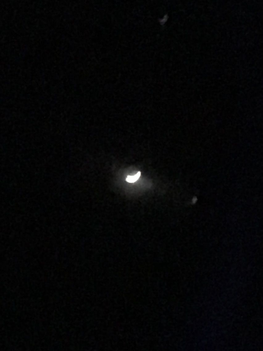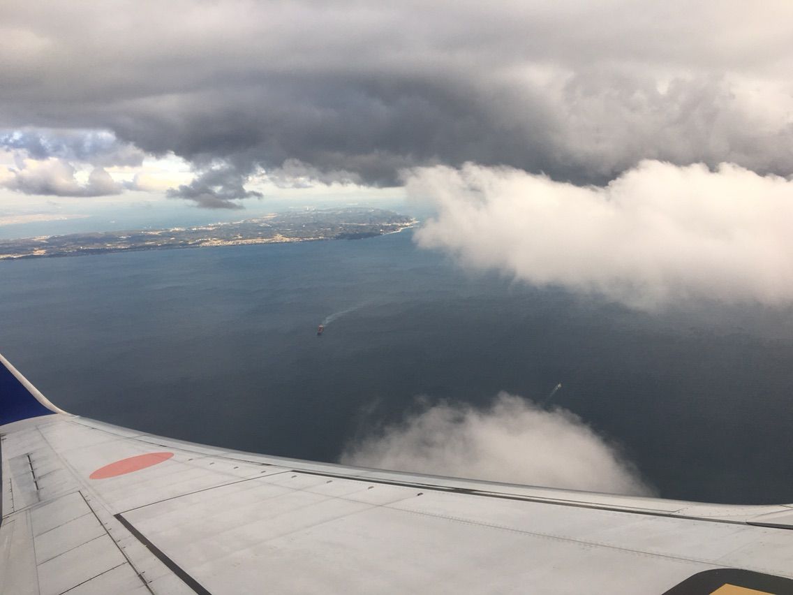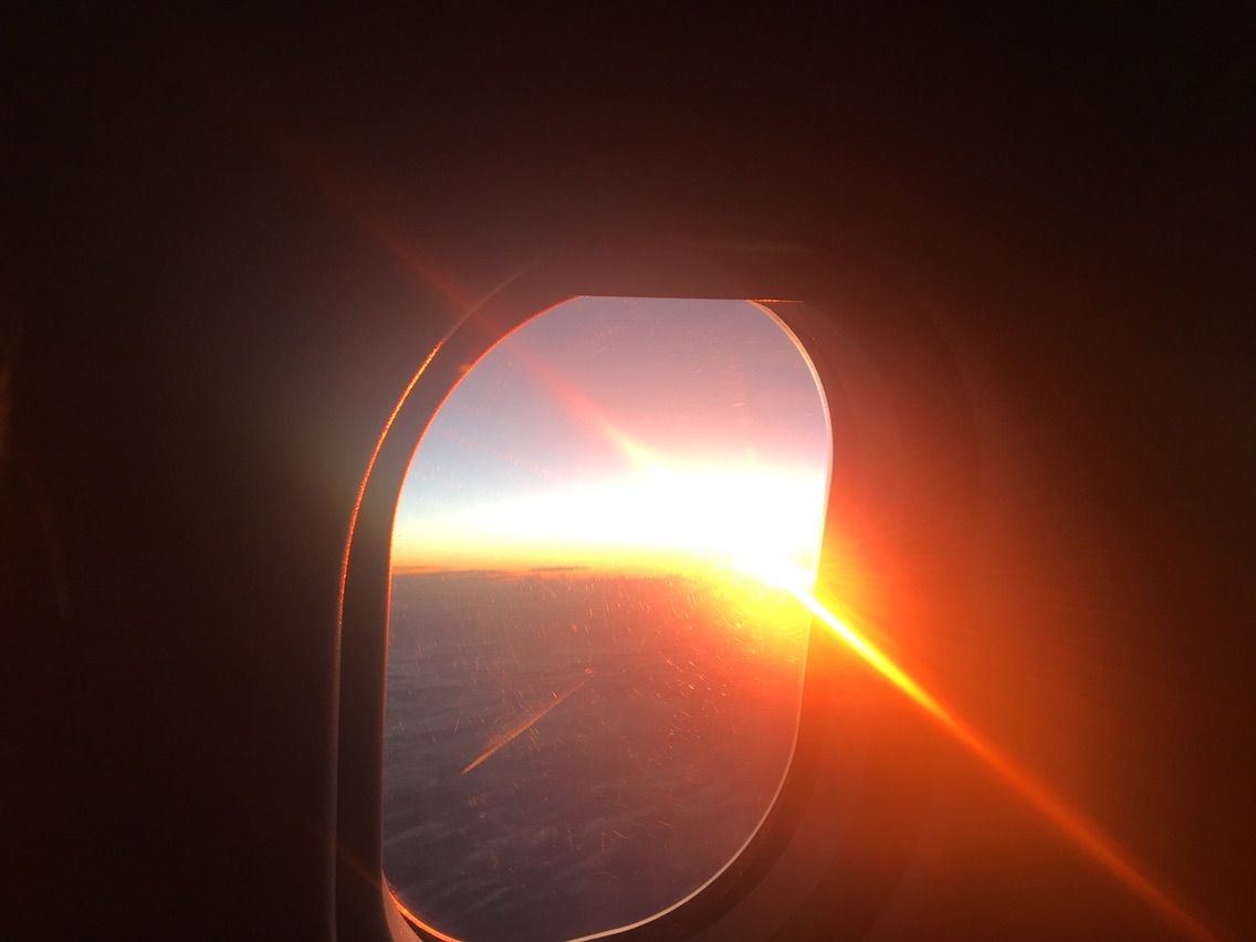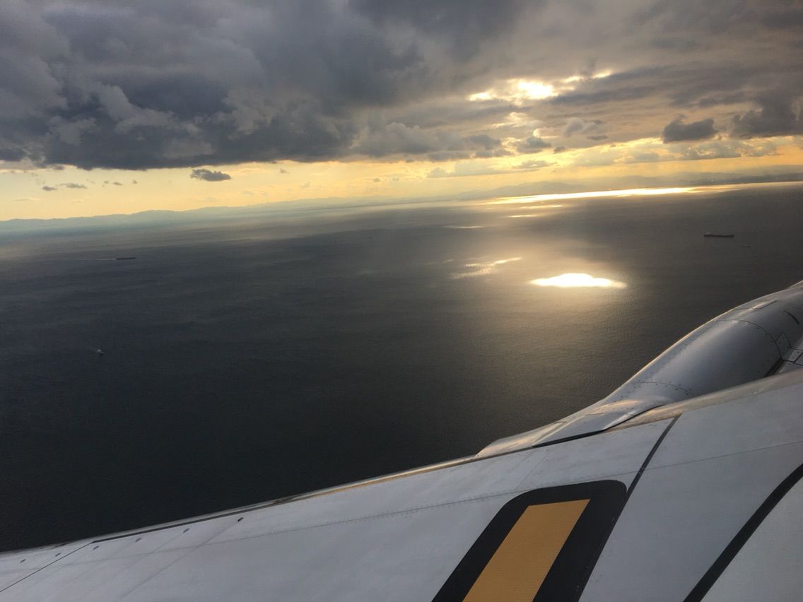 夕食は3種類選択できたので,お寿司にしました。座席の窓からはずっと二十六夜の月が美しく見えていましたが,やがて夜が明けると雲の上に美しい太陽が昇って来ました。しかし,空港に降りると雷雨でした。