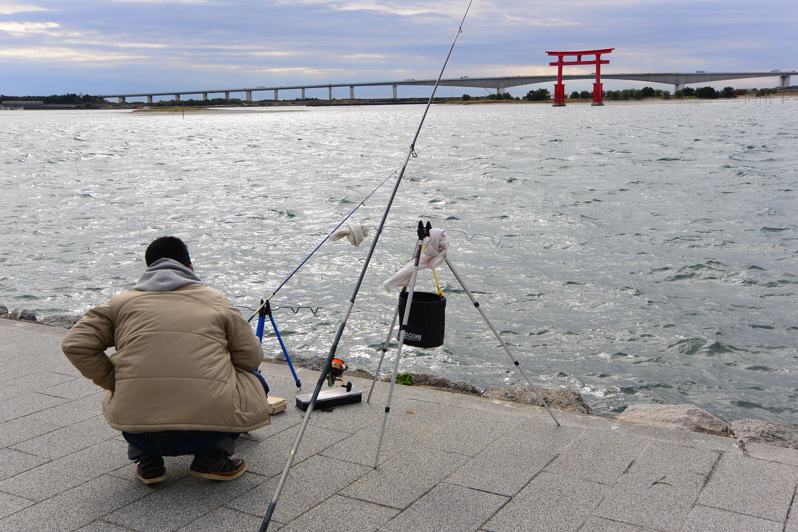 浜名湖には鳥居が作られていて,多くの釣り人がのんびりと糸を垂れていました。はるか向こうに見えるのは国道1号線の浜名バイパスです。