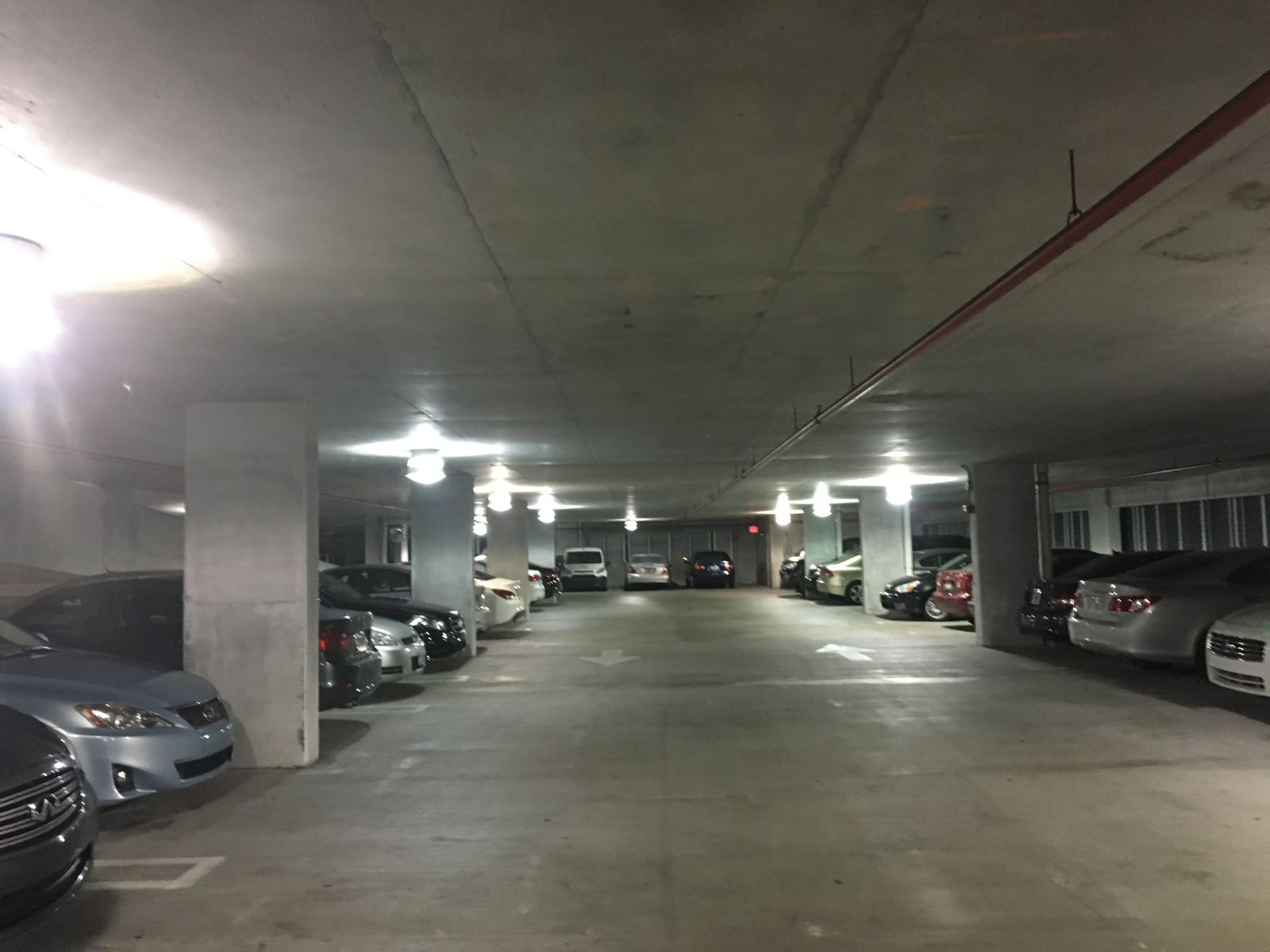 また、この建物の右側の別棟がパーキングで,その内部は3番目の写真のようになっている。各階の端っこの壁際に地味な扉があって,それを開けるとアパートの通路につながっているが,はじめてもときはこの扉の存在がかななかわからないからアパートにはいることができないわけだ。しかし,これでセキュリティが保たれているのかどうかはよくわからない。