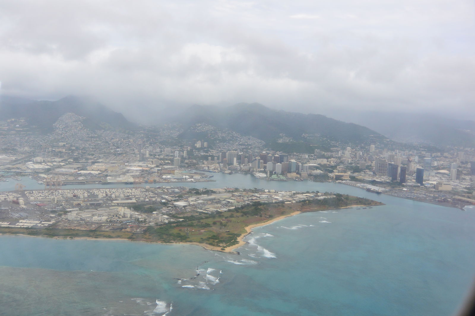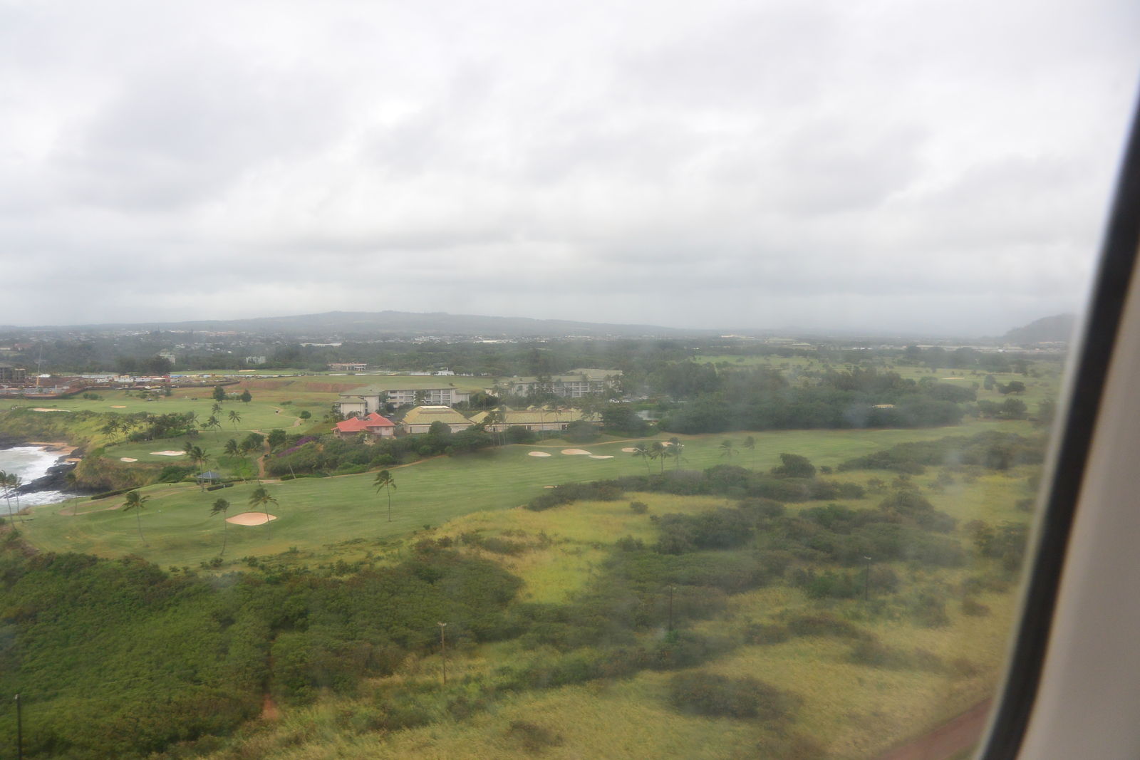 空港があるのは島の南東にあるリフエ(Lihue)という町である。空の上から見たカウアイ島は山と緑ばかりで,最も素朴な島,というイメージがさらに膨らんだが,天気はよさそうに思えなかった。