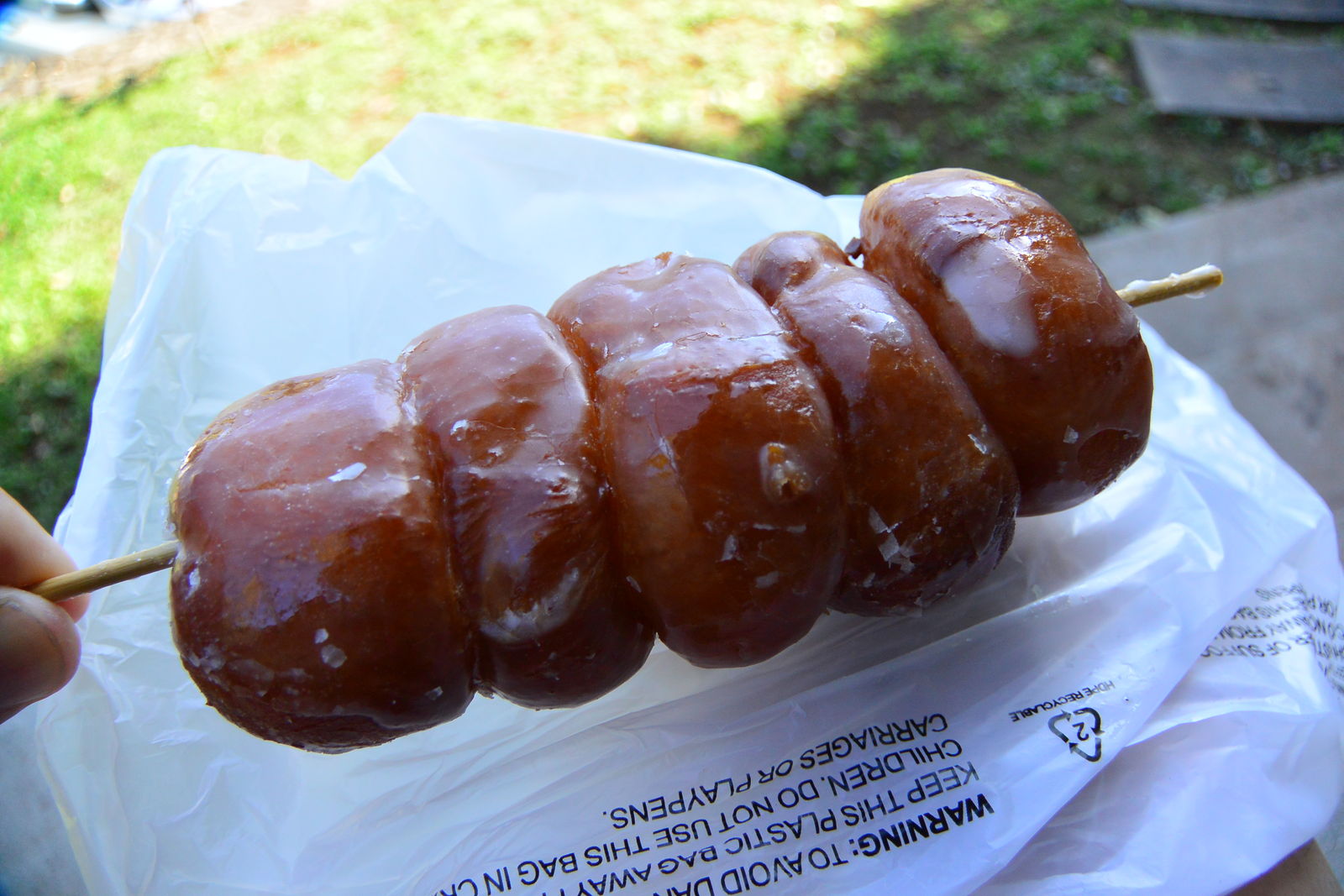 私は勝手がわからず,たった1個でも買えるのかな? そんな買い方をしている人がいるのかな? と心配であったがそれは杞憂であった。ほとんどの人が1個の串刺しドーナッツを買っていた。私も列に並んで1個の串刺しドーナッツを購入した。