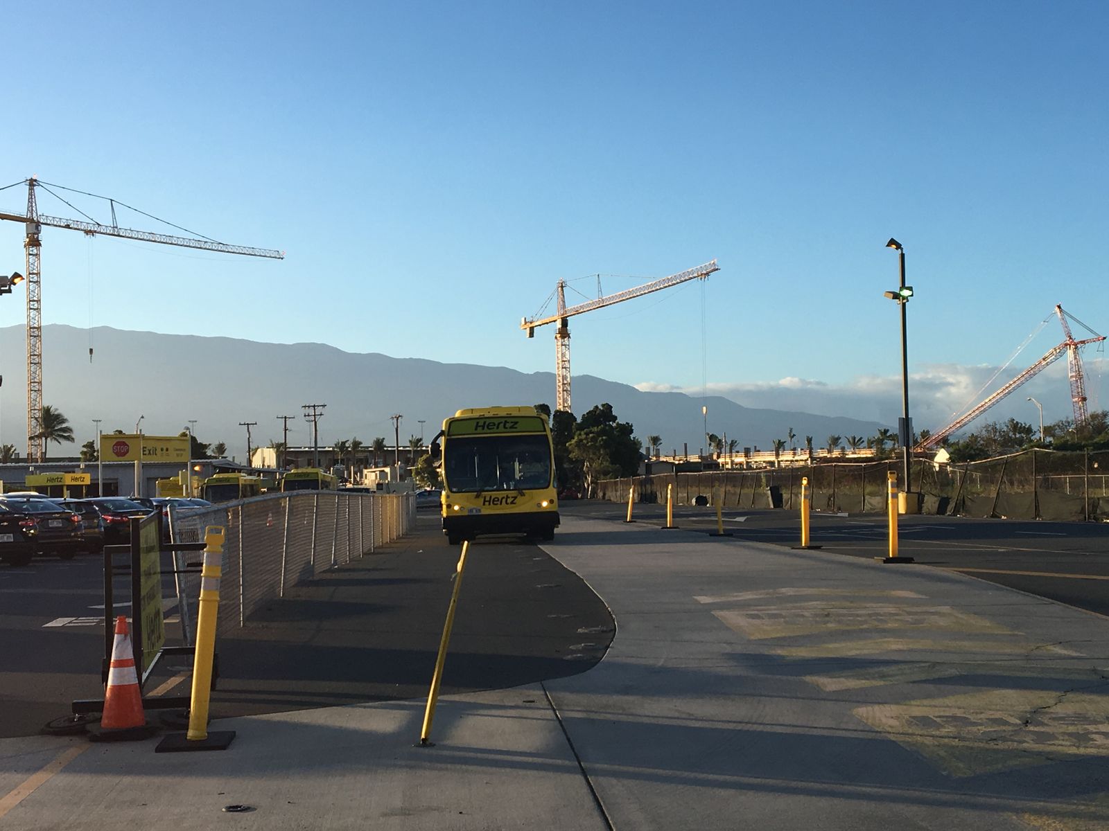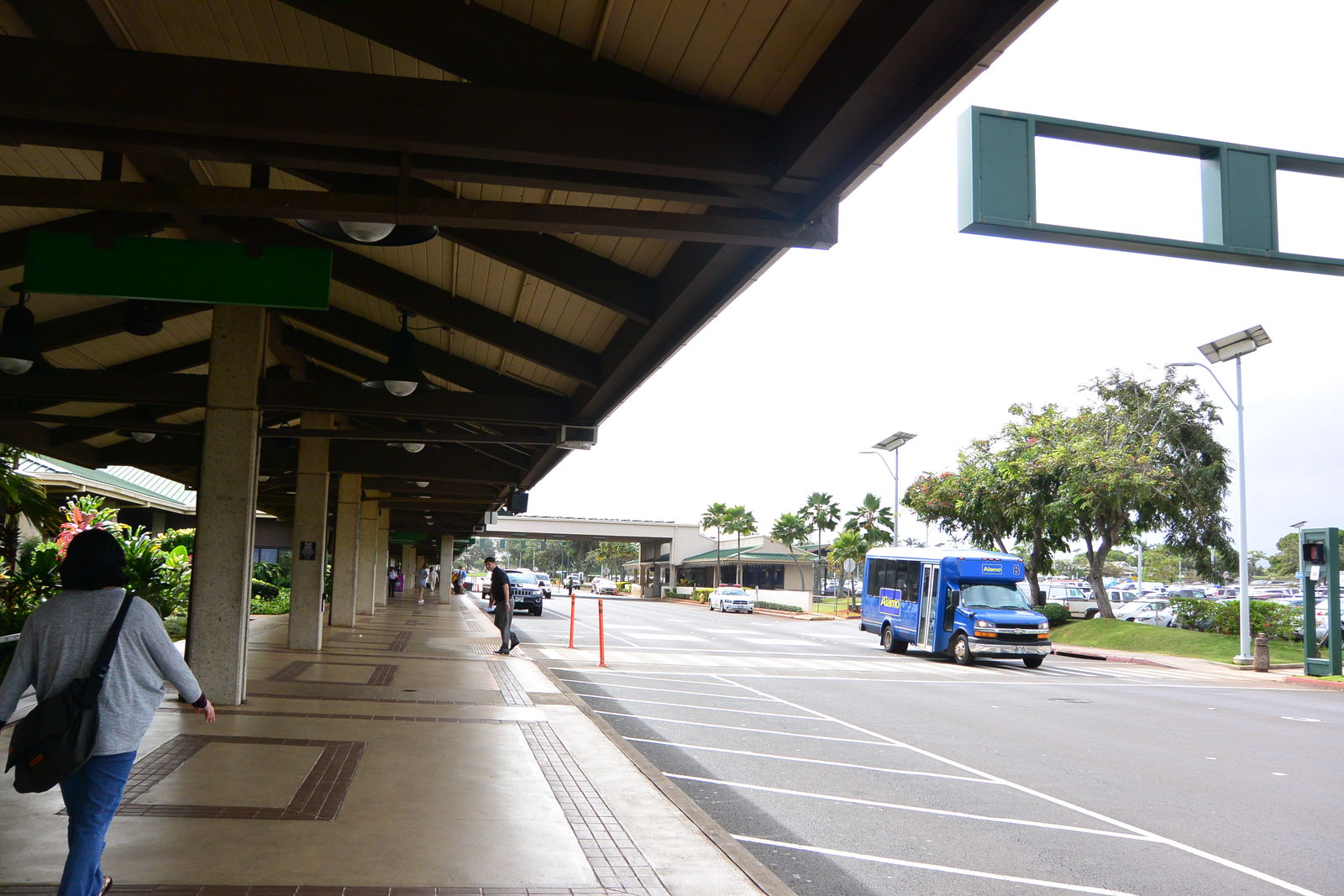 空港から出るとレンタカーのオフィスが並んでいるのもヒロ空港と同じであった。しかし,ヒロ空港の場合はレンタカー会社のオフィスが機能していて,そこですぐに車を借りることができたのだが,カウアイ島ではレンタカー会社のオフィスは(おそらく)今では手狭になってしまい空き家と化していた。そして,レンタカー会社の建物の裏手の,かつてはレンタカーの駐車場であっただろう場所にレンタカー会社へ周回するシャトルバンの停留所があった。