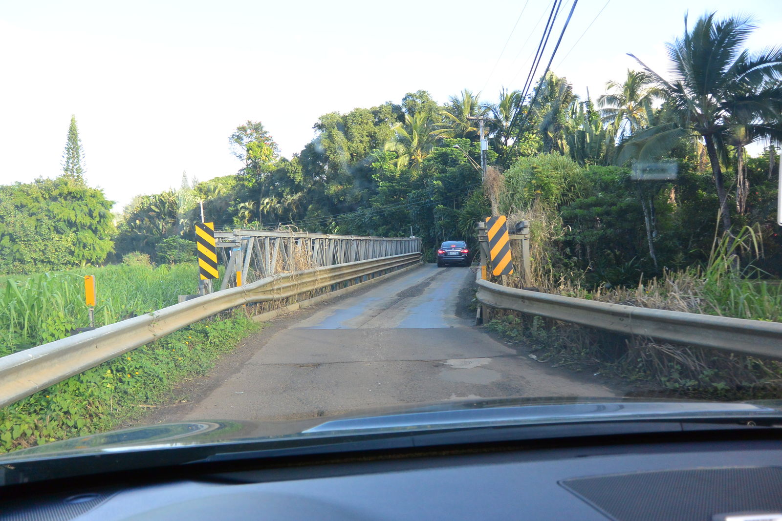 ハナレイの町を過ぎると道路は森の中の小路の様相を呈してきた。橋の幅は道幅よりもさらに狭く,マウイ島のハナに行ったときのような交互通行になった。ただし,マウイ島のときとは違ってこうした狭い道路も長くは続かない。なぜなら,まもなく道路は果てを迎えるからだ。