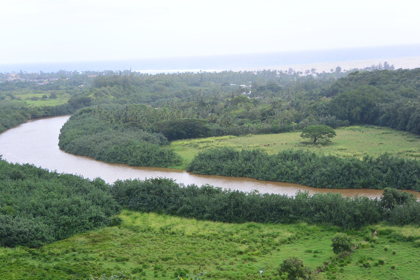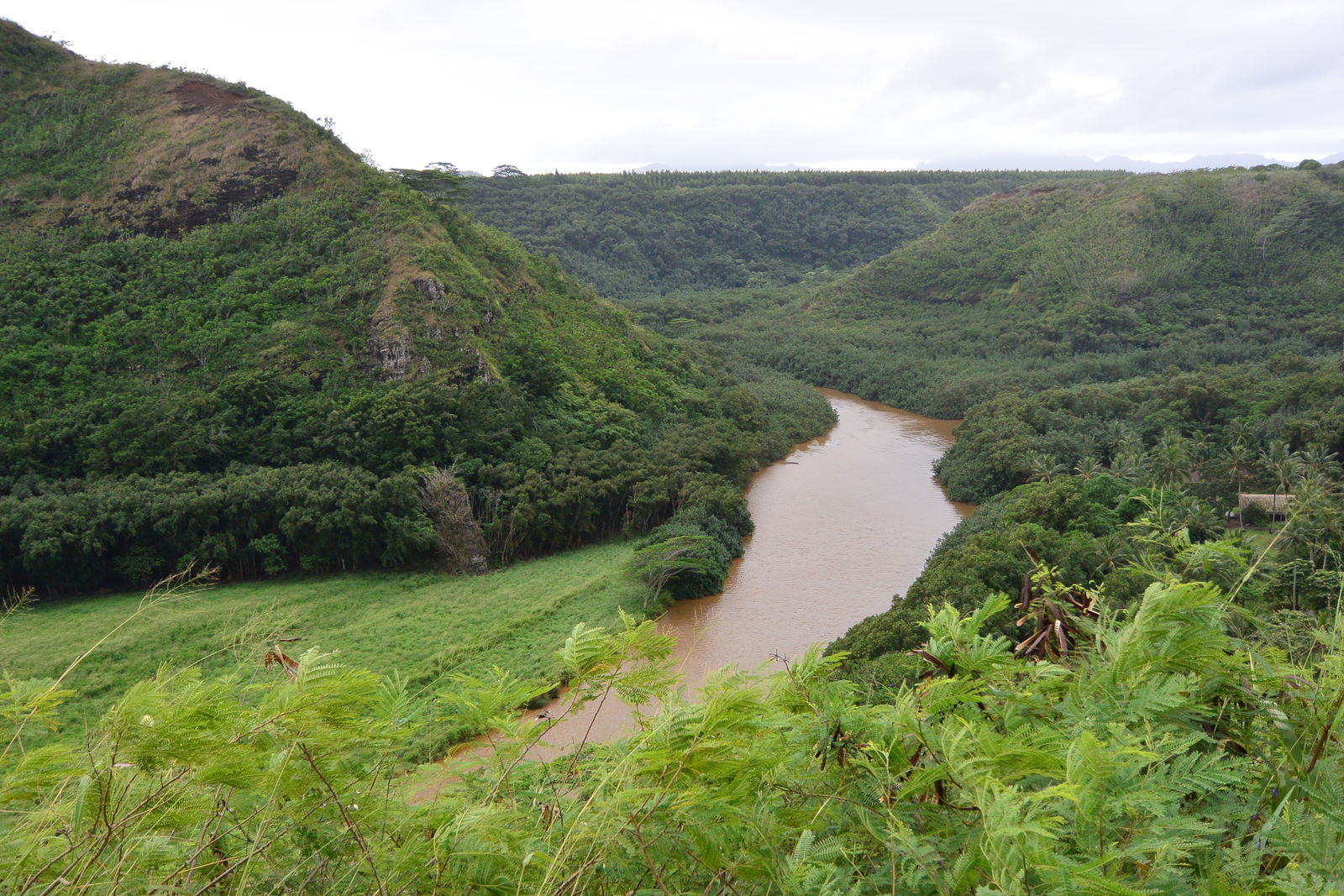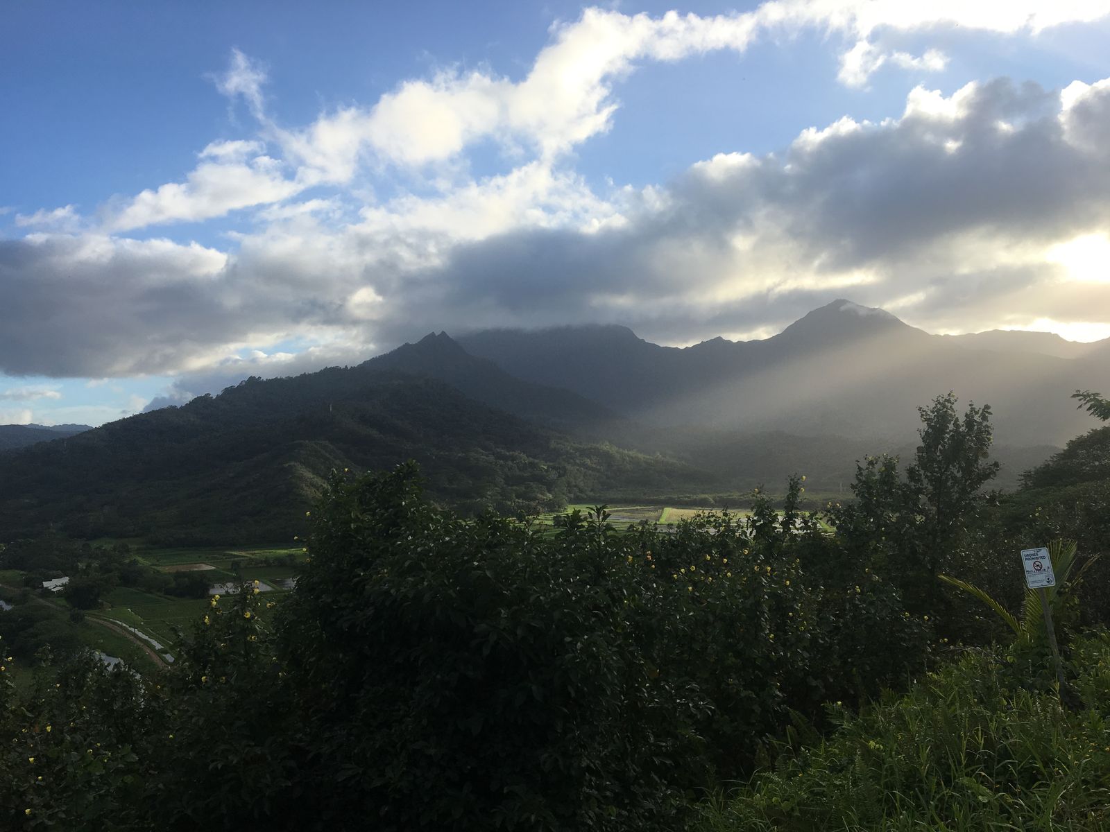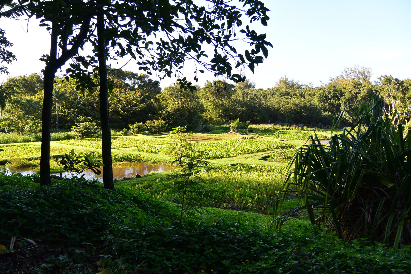 ここはタロイモの水田が並ぶハナレイ渓谷と国定野生動物保護区の一部をみおろす展望台になっていて,水田の背後にはワイアレアレ,ナモロカマなどの山々が連なり,手側にはハナレイ川がゆったりと流れているのどかな風景を見ることができる,古代ハワイから続くハナレイの美しい景観を一望できるスポットであった。