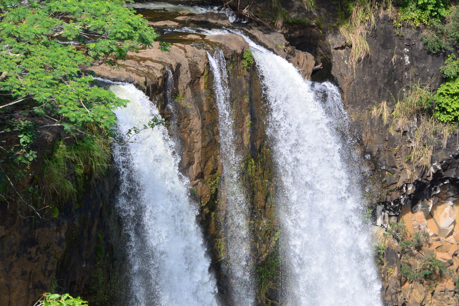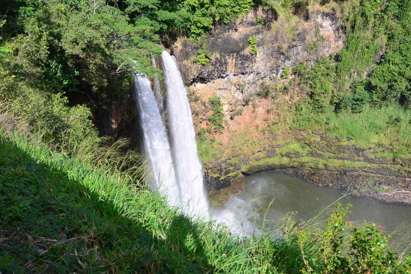 世界最大の降雨量を誇るワイアレアレ山に降る雨がワイルア川へと流れ,この場所で2筋の水流となって美しい滝を作っているのだという。クヒオ・ハイウエイから少し奥まっていることもあって,周囲は樹木に囲まれた緑で静けさに満ちていて,滝があげる瀑布の音だけが周囲に響いていた。