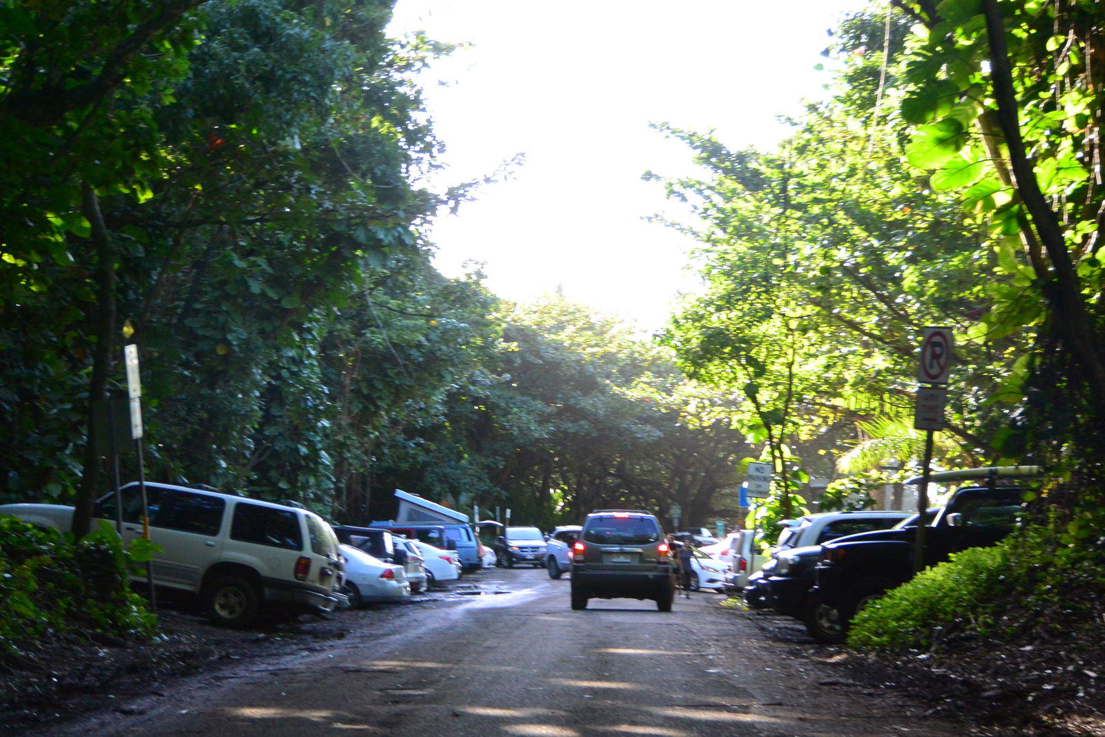 「ハエナビーチ」から更に1マイル(1.6キロメートル)進み,州道560の行き止まりに「ケエビーチ」(Kee Beach)があった。「ケエビーチ」は終点であるから駐車場や路上駐車の争奪戦が激しく,なかなか停める場所がないということであった。私も一度は駐車場に入っていったがどこも空いておらず,引き返して少し戻り,そこにあった公園の駐車場に車を停めて歩くことになった。