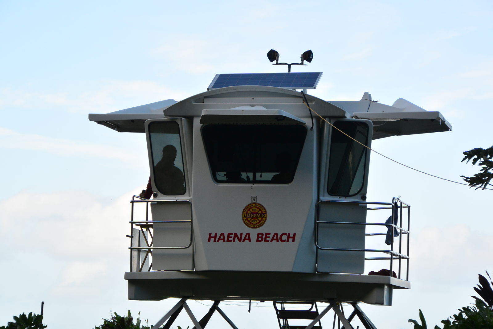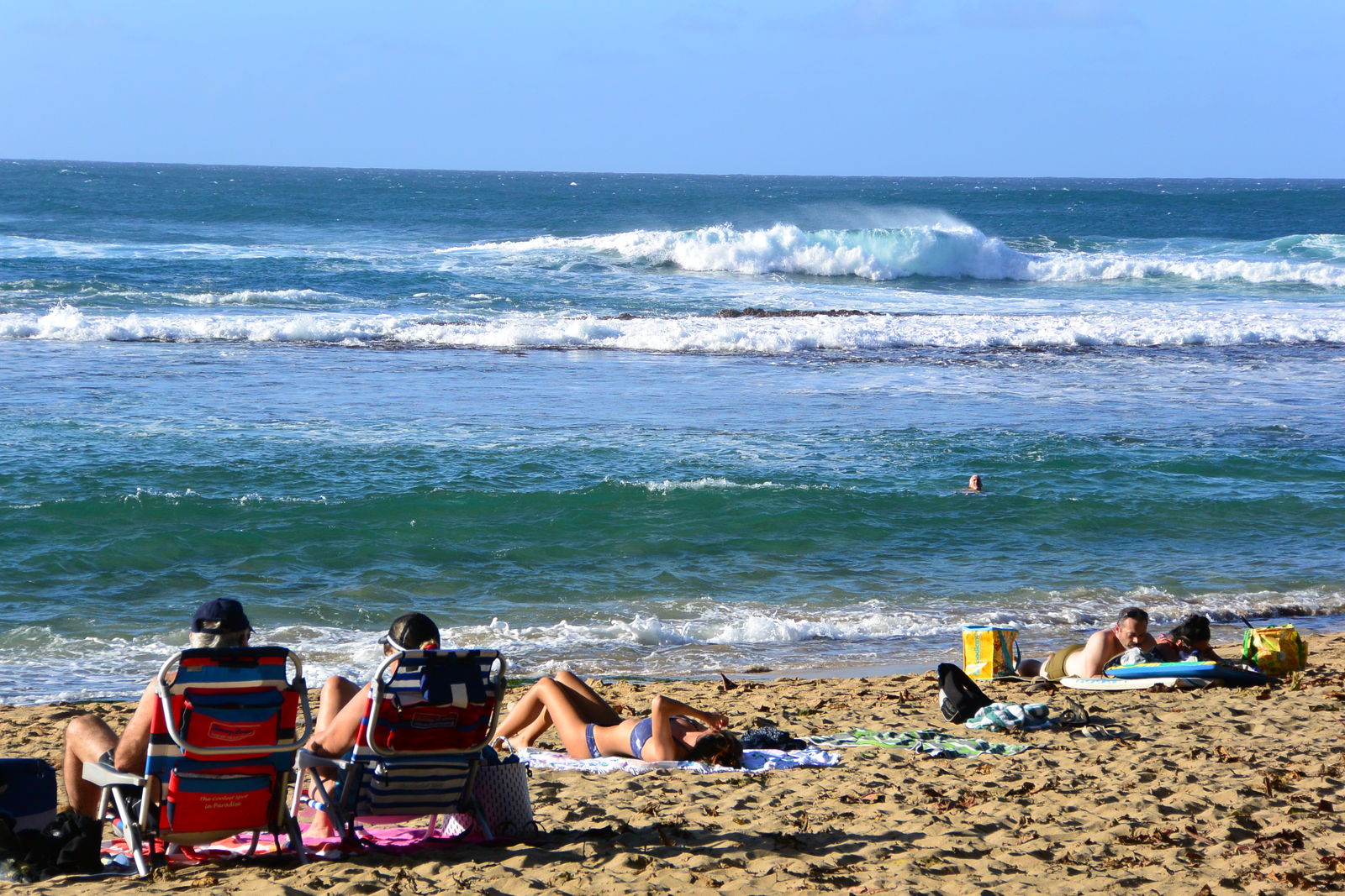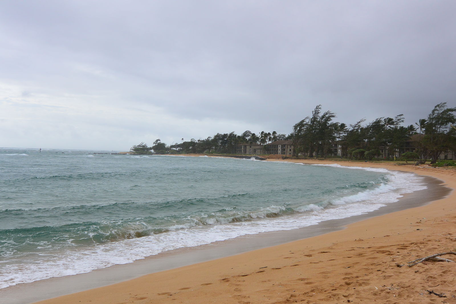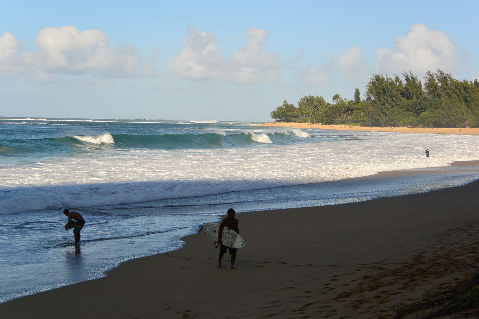 「ハエナビーチ」にはまぶしい砂浜が広がり,夏でも波がそこそこある,いかにもハワイという感じのサーフスポットが広がっていた。
