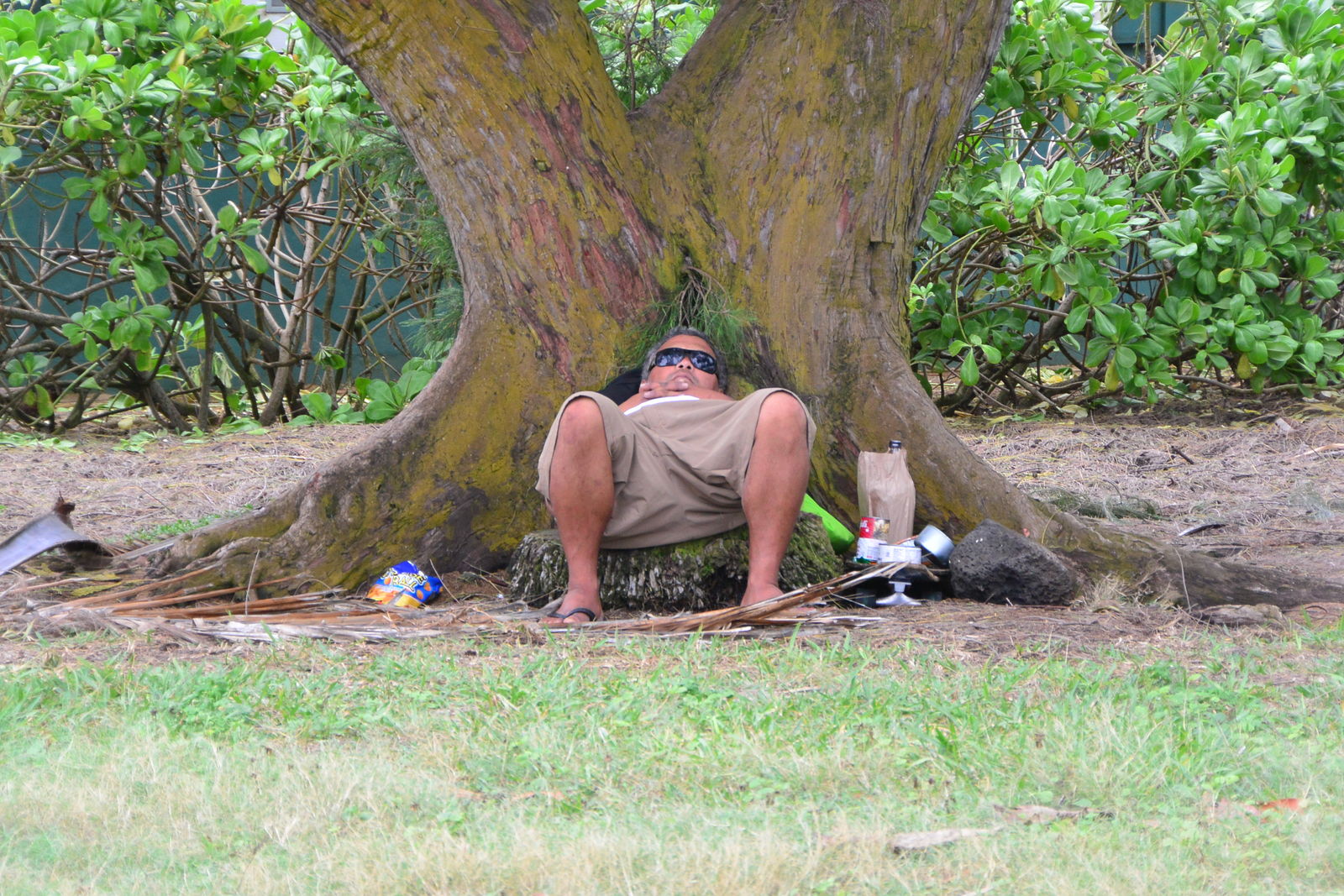 ここの砂浜はやわらかく高さがあり,波打ち際まで波が崩れないのだそうだ。ここを東に,つまり,海を目の前にして右手の砂浜を延々と歩いていくと「マクアビーチ」(通称トンネルズビーチ)になる。そこは透明度が高く,ダイビングに最適なエリアである。「トンネルビーチ」と呼ばれる岩礁は海中にあってベストスキューバダイビングポイントのひとつとして紹介されている。こうした地元民のビーチこそがハワイであるといつも思う。ワイキキビーチなどくそくらえだ。