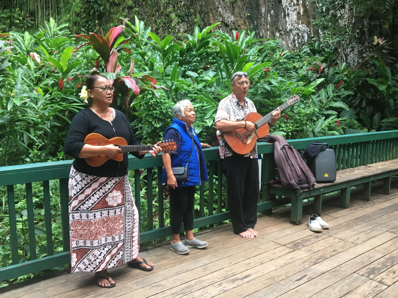 洞窟を見ている間に,再びライブでハワイアン・ミュージックが演奏された。ゆるやかな音楽を耳にしながら,その昔,ここで結婚の儀式や宴を行ったハワイの王族たちに想いを馳せてみるという趣向になっているわけだ。乗客のひとりだった背の低い女性がしゃしゃり出てきて一緒に歌を歌ったのだが,それがまあすごく上手であった。これが演出なのかハプニングなのかはわからなかった。