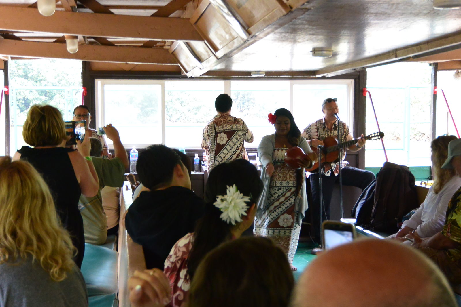 ワイルア川一帯の説明とともに,フラとハワイアン・ミュージックがライブで流れている。濃厚な緑で縁取られたワイルアの川とその周辺の景色の中をゆったりとしたスピードで遊覧船は進んでいき,なかなかいいムードであった。