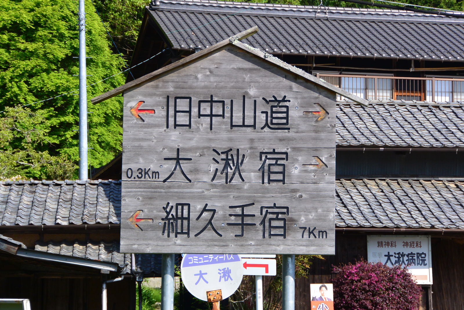 私はこの日は大井宿をめざしているので,ここを右に曲がりました。そこからが大湫宿の集落で,狭い道路をはさんで家並みが続いていました。
