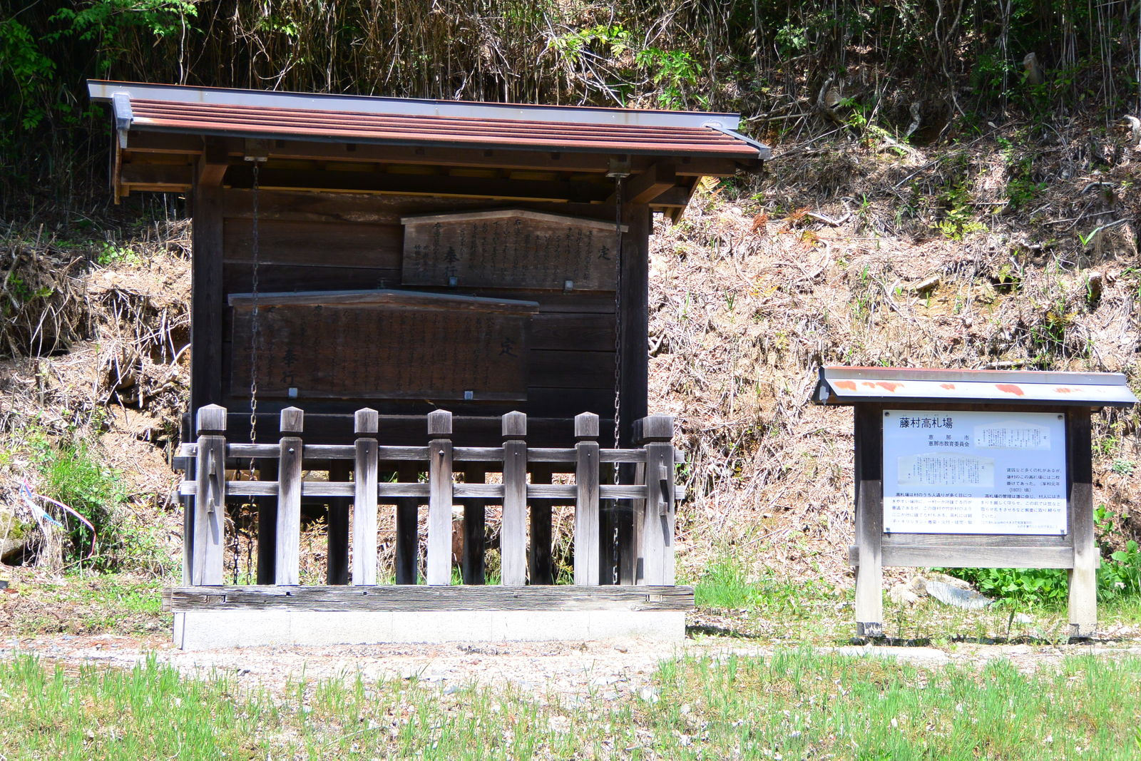 高札場というのは,古代から明治時代初期にかけて行われた,法令を板面(=高札)に記して往来に掲示し民衆に周知させたものです。木の札に,表題,本文,年月日,発行主体が書かれてあって,これを屋根がついた人目に目立つ一段高くなった高札板に掲げました。