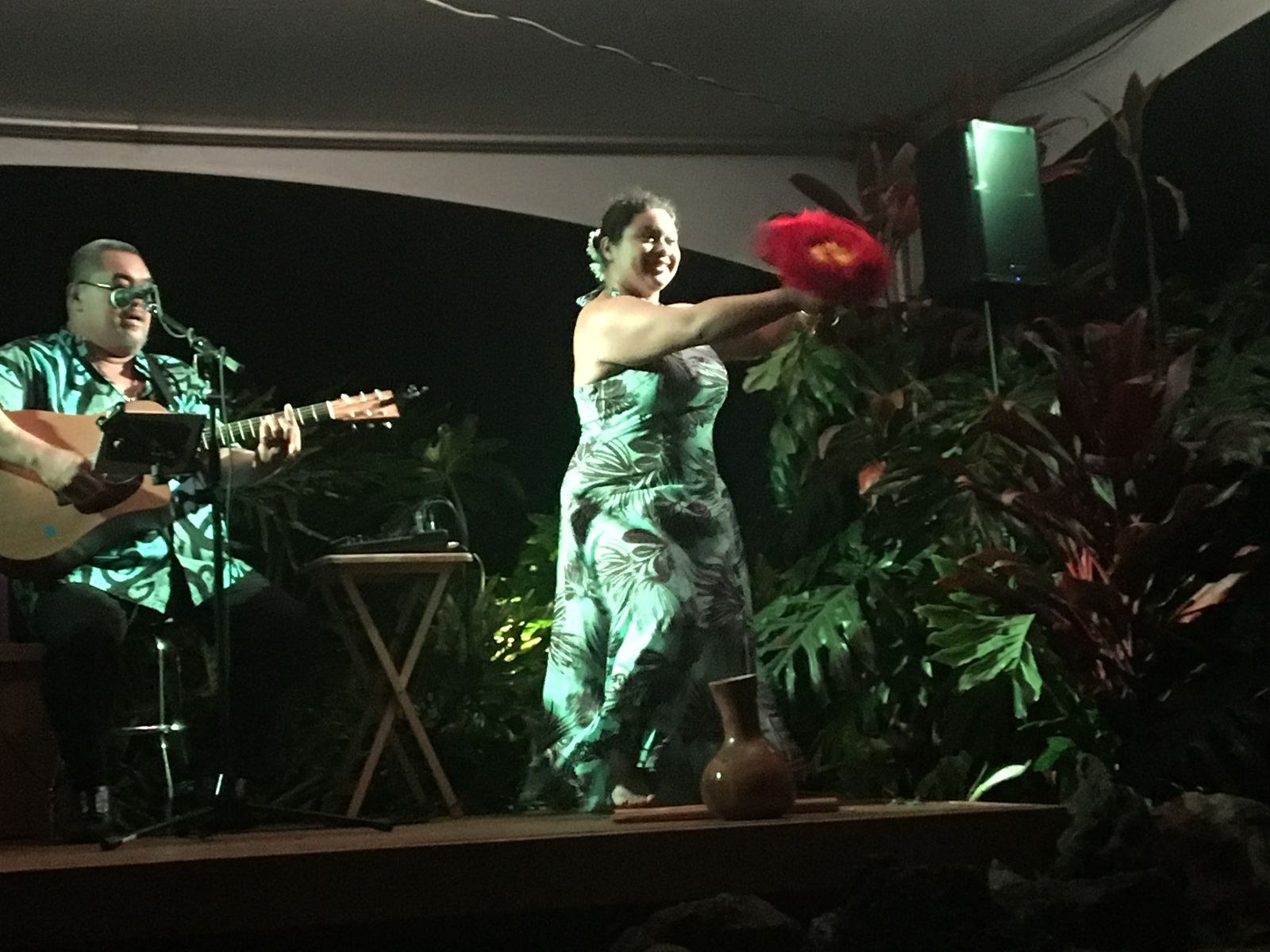 ここは,機関車に乗るチケットを購入して場内を一周して,線路の周りに残るカウアイプランテーションを味わい,最後に食事をする,というような嗜好であるらしい。プランテーションには果樹園があったり,野生のブタやヤギ,羊の群れが草を食む様子などを見ることができて,食事の際には,ハワイアンミュージックを聞きながらフラの公演やら芝居を楽しむことができるというわけである。