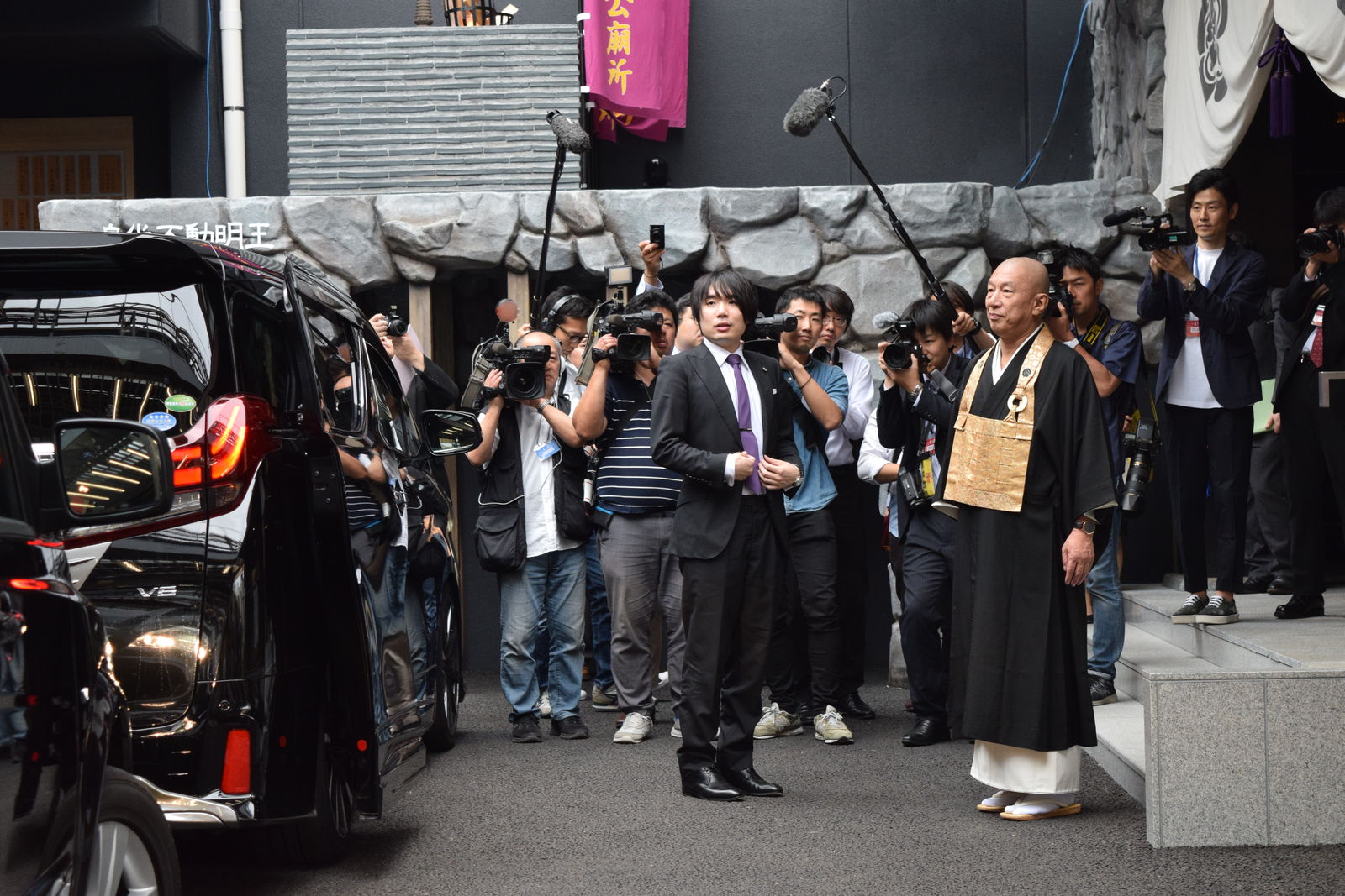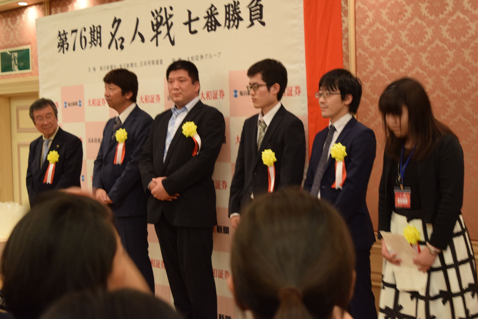 前夜祭は午後5時30分受付開始,午後6時開始ということで,会場は萬松寺の近くのローズコートホテルでした。私は午後4時過ぎに萬松寺に着いたのですが,ちょうどそのとき対局場の見分に現れたのが両対局者で,それを偶然目撃しました。