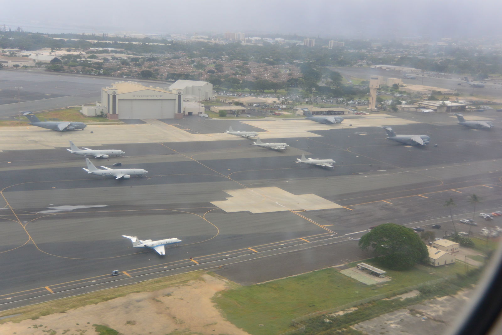 着陸して到着ゲートに向けて飛行機が滑走路を走行しているときに機内からみたフェアバンクスの空港は,ものすごく広々としていた。アメリカ空軍の戦闘機がたくさん留まっていたのはこの空港が軍の空港を兼ねているからだろうが,それ以外はアメリカ本土の非常に混雑した空港とはまるで違っていて,ほとんど旅客機がいなかった。