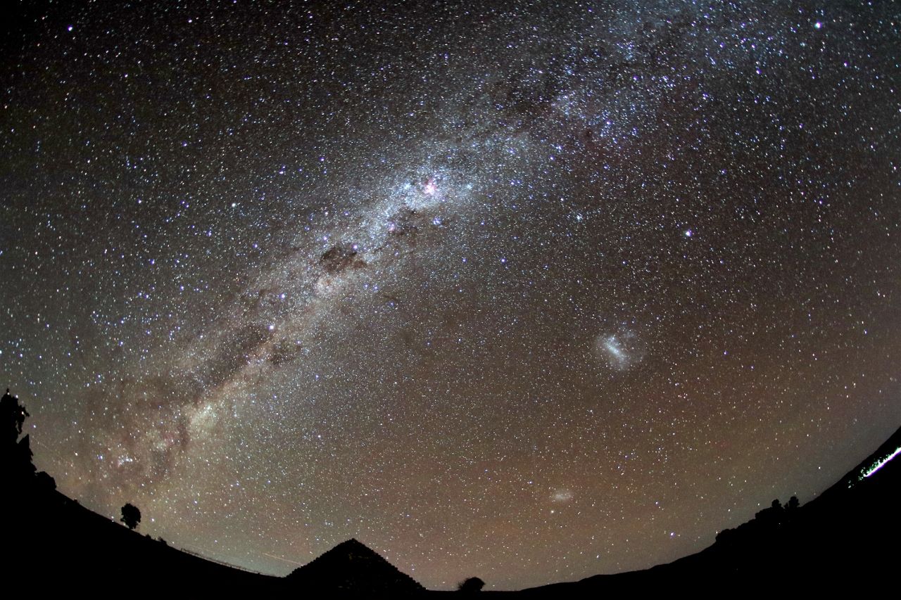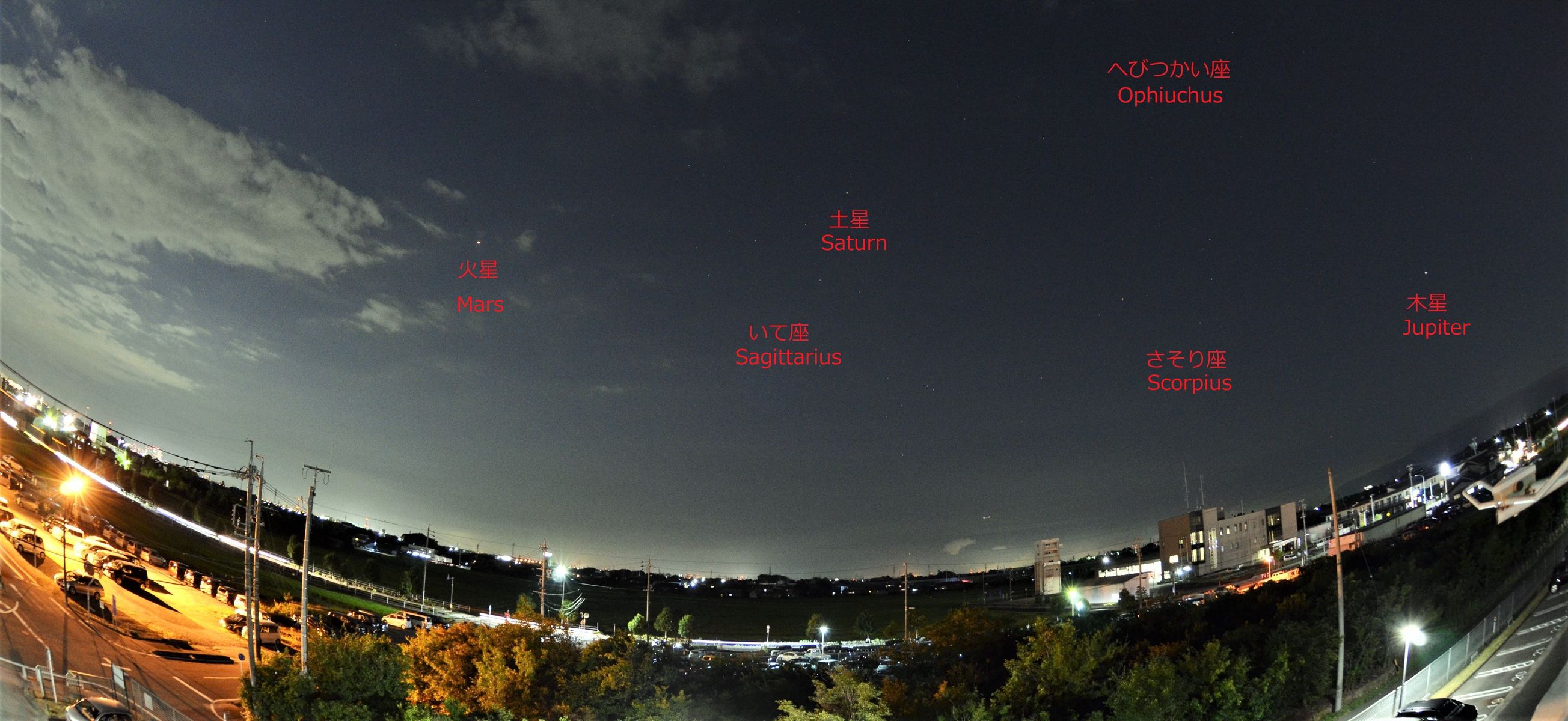 期待した7月28日早朝の皆既月食は残念ながら曇ってしまってまったく見ることができませんでした。晴れていたら,私の家からは山に沈む赤い月とそのとなりの火星が最後まで見らたはずなのでとても残念でした。そのかわり,その2日後,火星が大接近した日に,魚眼レンズで火星,木星,土星の写真を1枚に収めました。