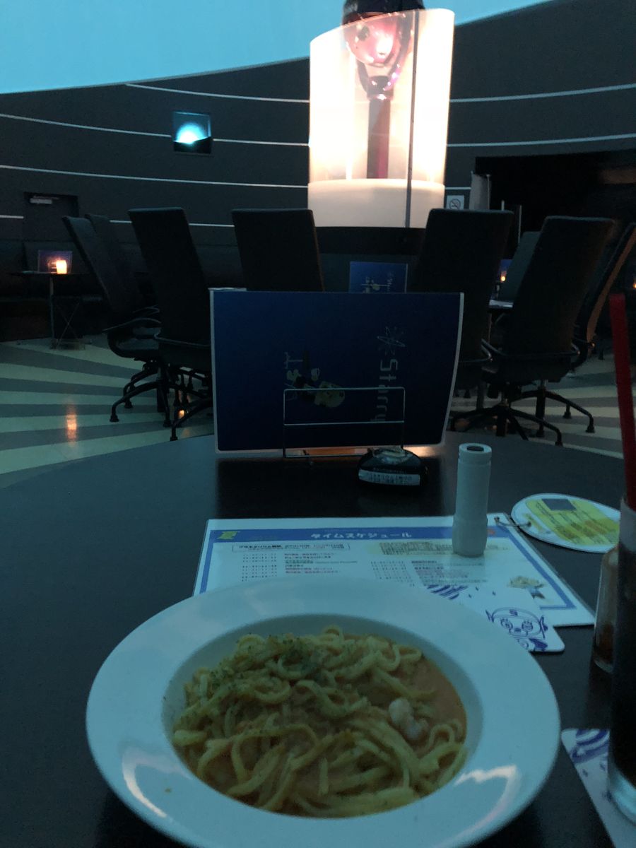 プラネタリウムは1時間くらいの周期で同じようなプログラムを繰り返していた。私は,機内で食事が出るまでの数時間の空腹を埋めるために,パスタとジュースを注文して,それを食べながら時間を費やした。