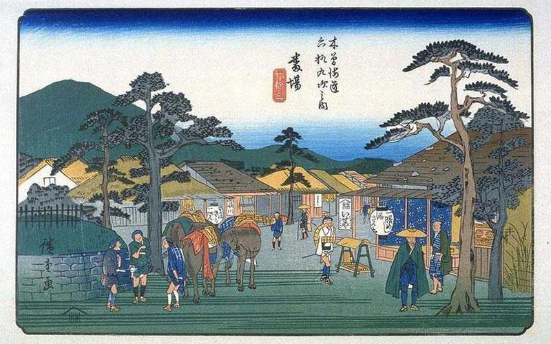 この加宿境宿新田が猿が馬場と呼ばれた地で,茶店では名物かしわ餅が売られていました。歌川広重の東海道五十三次の二川宿の題材とされた場所だそうです。猿が馬場は二川宿ではなく白須賀宿なので,これは変です。