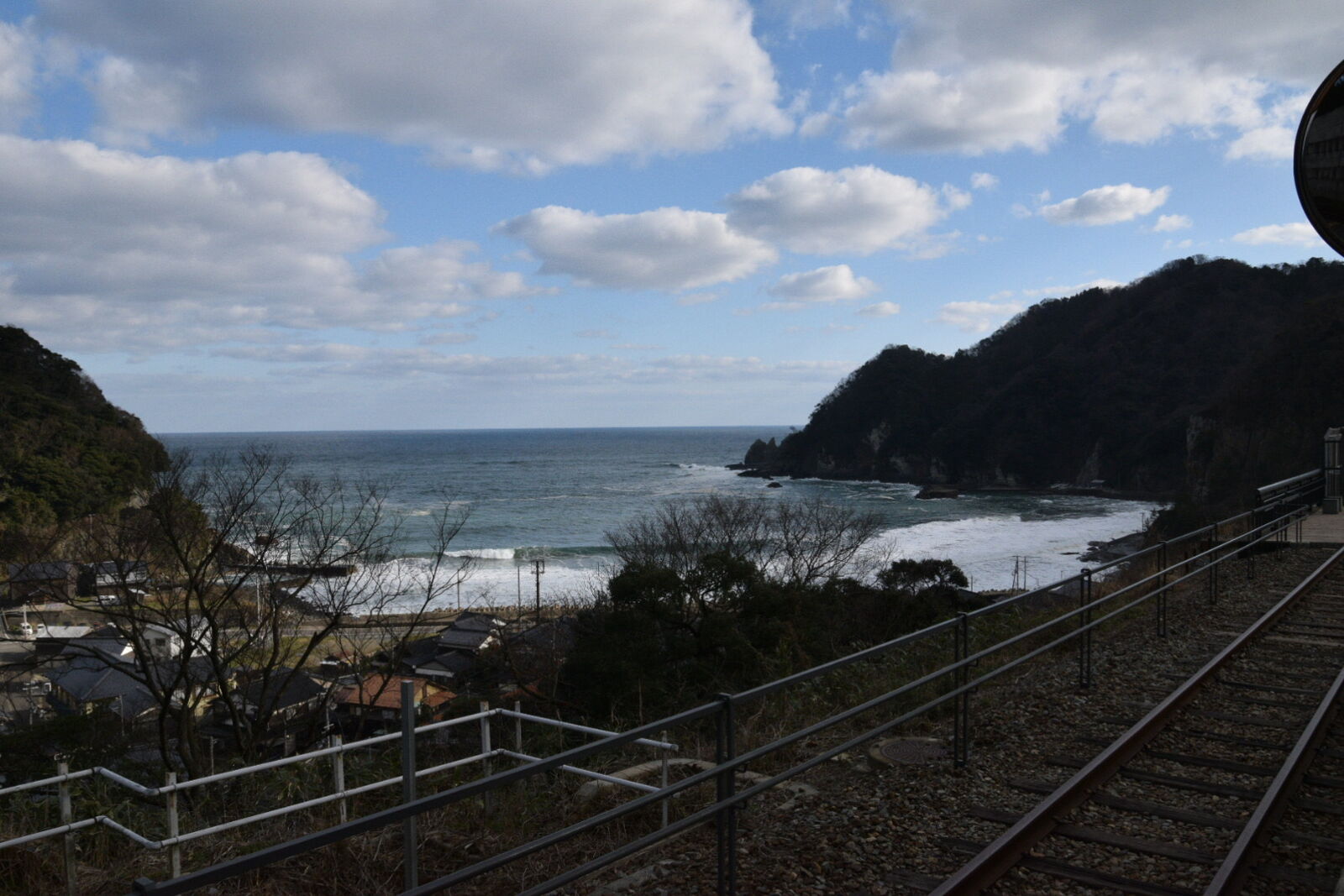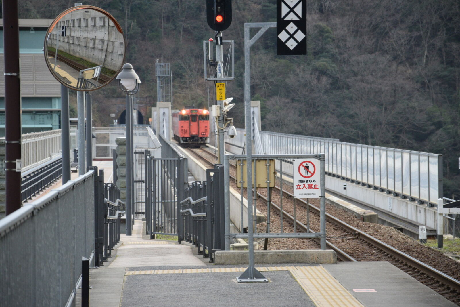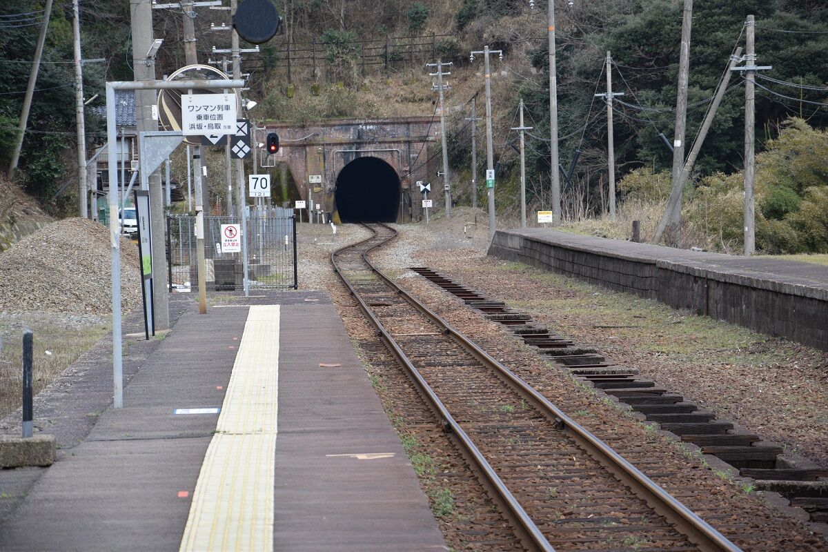 ところで,鎧駅は1日の利用客が平均8人ほどだそうです。餘部駅が50人ほどなのですが,ずっと昔は餘部駅はなく,余部の人たちは線路を通ってこの鎧駅まで歩いたということです。鎧駅から餘部駅の方向を見ると,すぐにトンネルがあります。鎧駅の標高で余部まで行くと,余部鉄橋が必要なだけの標高差があるということになります。こんな過酷な自然環境に鉄道を走らせる必要があったわけで,そりゃ,計画された当時は大変な難題だったことでしょう。
