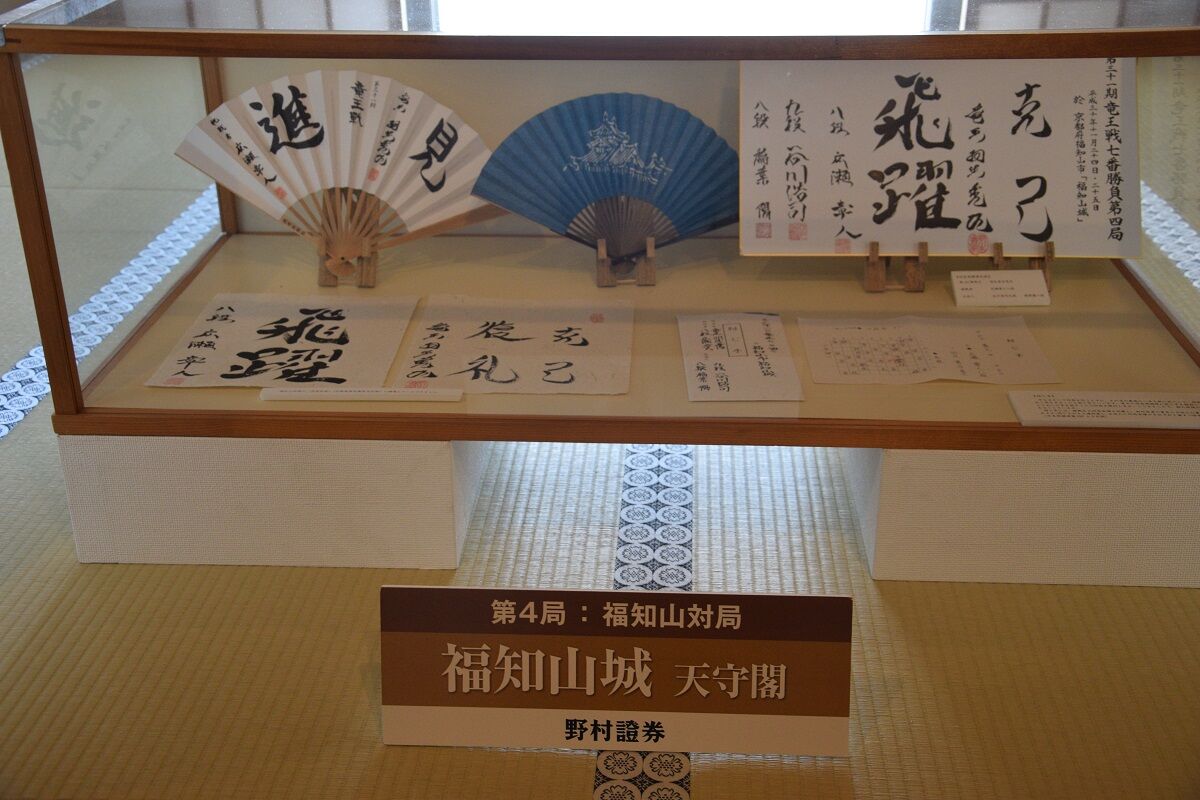 福知山城の御殿では,2018年11月24日から25日にかけて第31期将棋「竜王戦」の第4局が行われたそうで,そのときの記念品が飾られてありました。対局者は羽生善治竜王と広瀬章人八段で,最後まで勝負の行方が分からない熱戦の末,広瀬章人八段が羽生善治竜王に勝利しました。