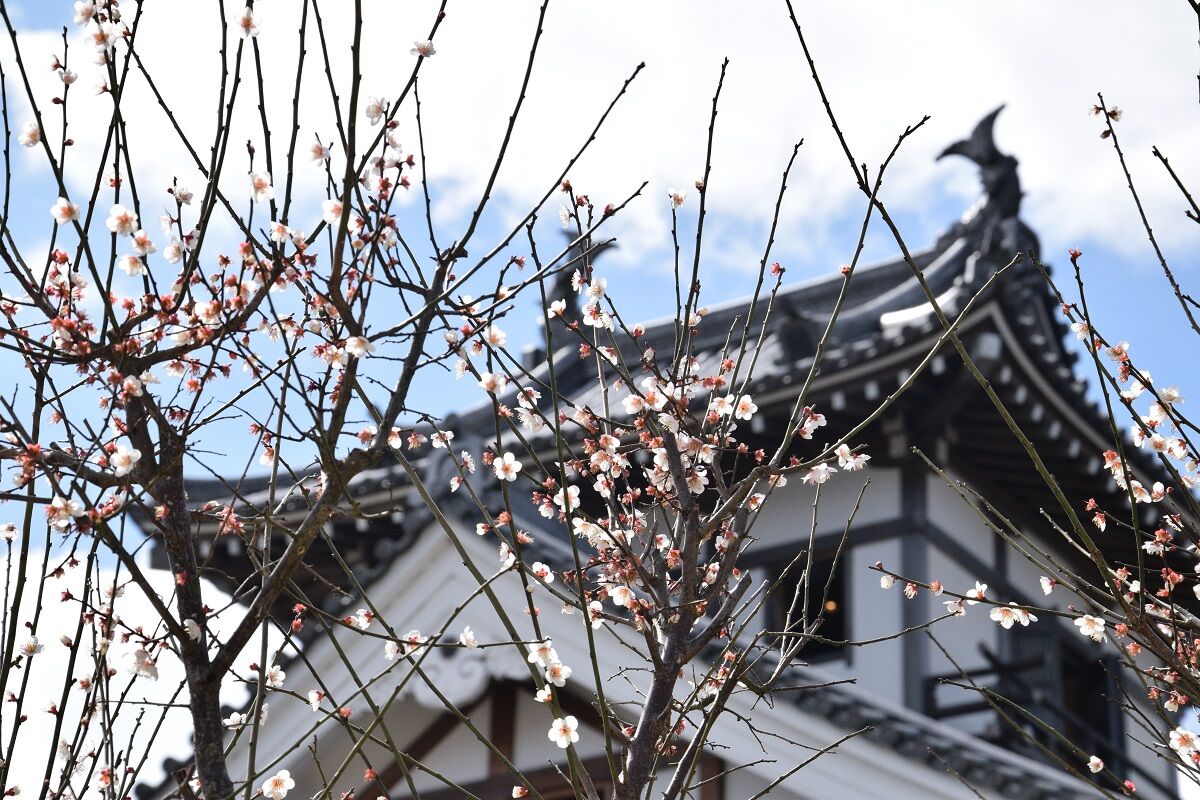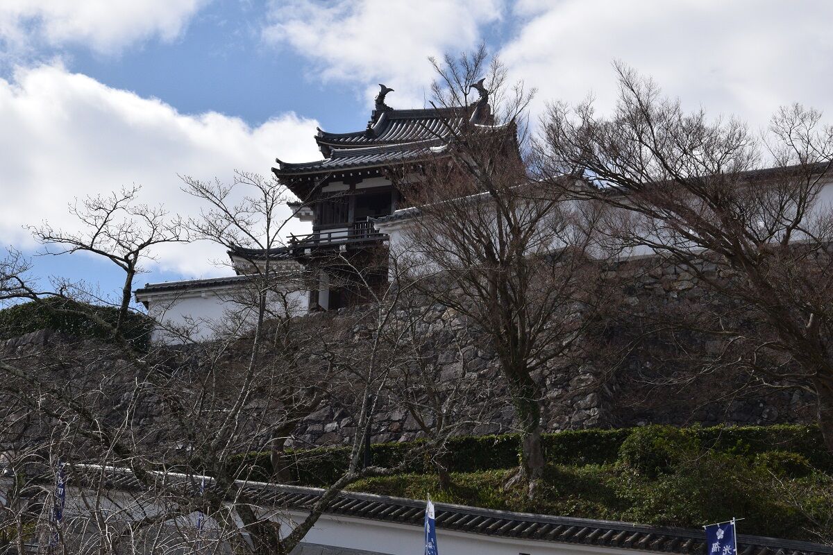 駐車場からは高台にある見事なお城がそびえているのがよくながめられました。早咲きの桜がきれいでした。