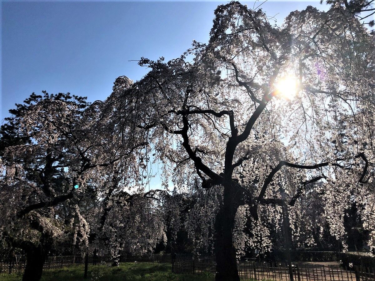 京都御所の一角を左に見ながら歩き,京都御所の北側に着きました。すると,まばらにですが,あたりにカメラを持った人が集まっていました。そこは近衛邸跡で,そのあたりには数多くのしだれ桜が満開に咲き誇っていました。これを見ただけで,来た甲斐があったと満足しました。