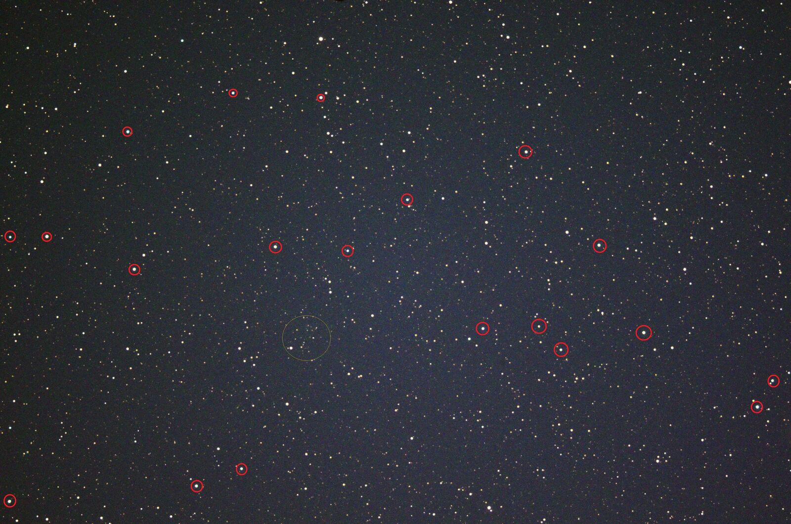 で,その結果,アトラス彗星は今日の1番目の写真のように,かわいい姿を写すことができました。しかし,岩本彗星は写りませんでした。2番目の写真で赤い〇で囲んだ星々がステラナビゲータというソフトで表示される星,そして,緑色の大きな〇で囲んだ範囲に岩本彗星がある「はず」なのですが…。思ったより暗いのか拡散しちゃったのか,あるいは露出時間がまずいのか???