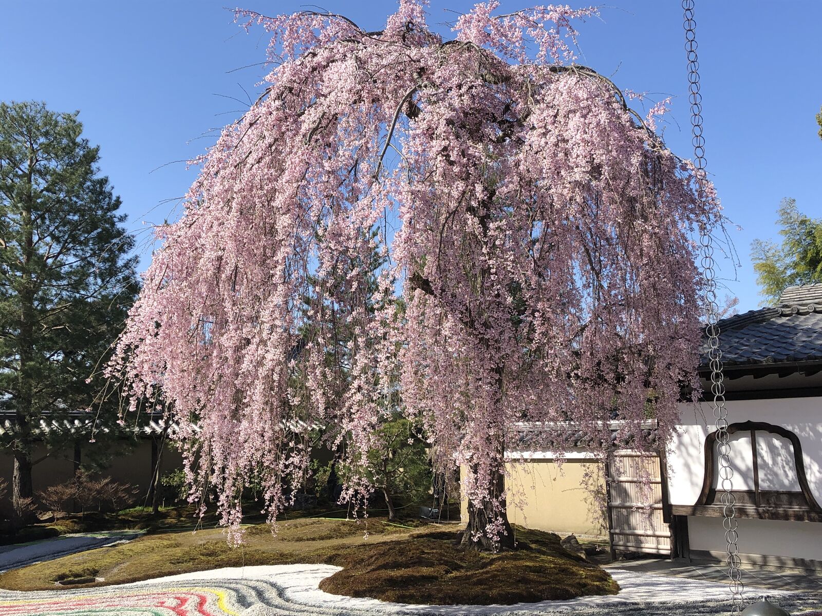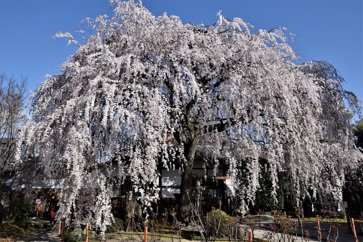 高台寺は,江戸後期より方丈の前に広がる波心庭のしだれ桜が有名となり,現在のものは4代目です。白砂が美しく掃き清められた方丈前庭の唐門の向かいに大きな枝垂れ桜が優雅に花を開き,この姿を求めて例年春はひときわ多くの人がやってきます。私もこれまでにも何度か来たことがありました。