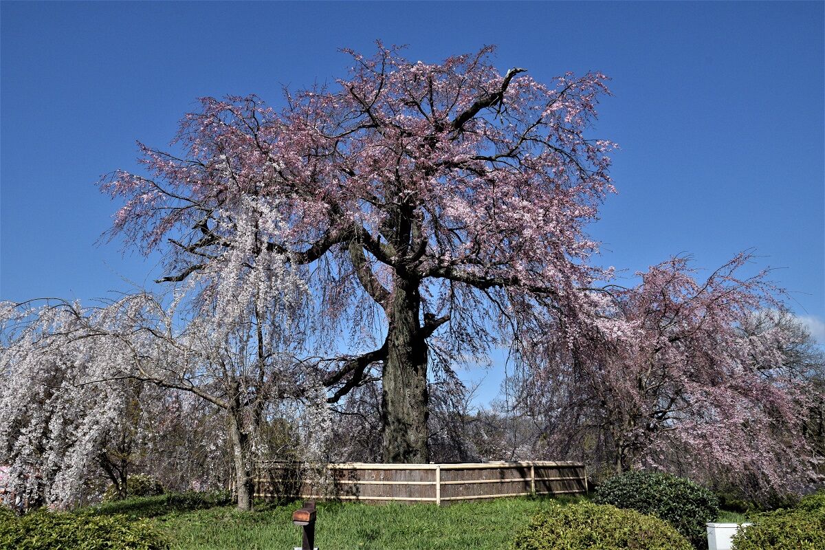 円山公園で最も人気が高いのが通称「祇園しだれ桜」,別名「祇園の夜桜」です。正式名称は「一重白彼岸枝垂桜」(ひとえしろひがんしだれざくら)といいます。現在の木は2代目で,初代のしだれ桜は1947年(昭和22年)に樹齢200年あまりで枯死,その種子から大切に育てた桜を桜守の15代佐野藤右衛門さんがが移植したのです。この2代目もすでに樹齢は90年を超え,高さは約12メートルもあります。