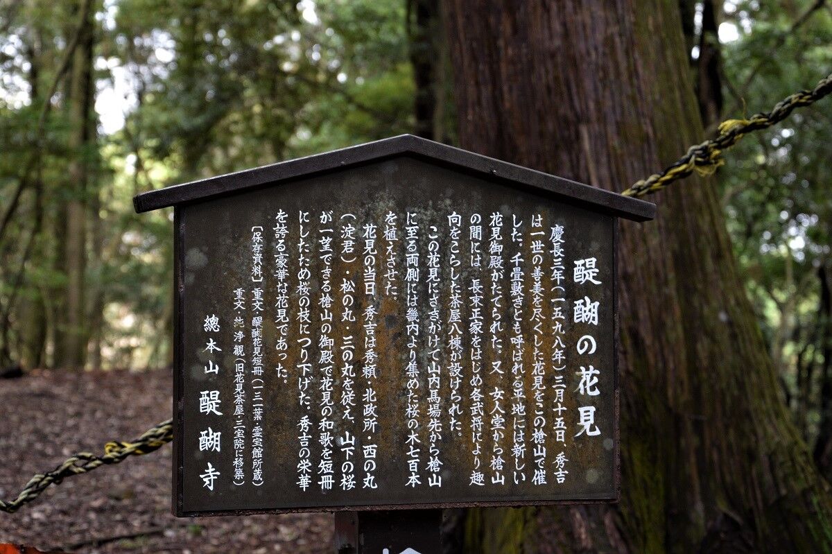 深雪山とは桜花爛漫するさまを雪に喩たもので,これ以来,深雪山は上醍醐寺の山号になっています。また,醍醐の花見が行われたのは,現在の伽藍の場所ではなく,その奥の上醍醐のふもとあたりのことでした。