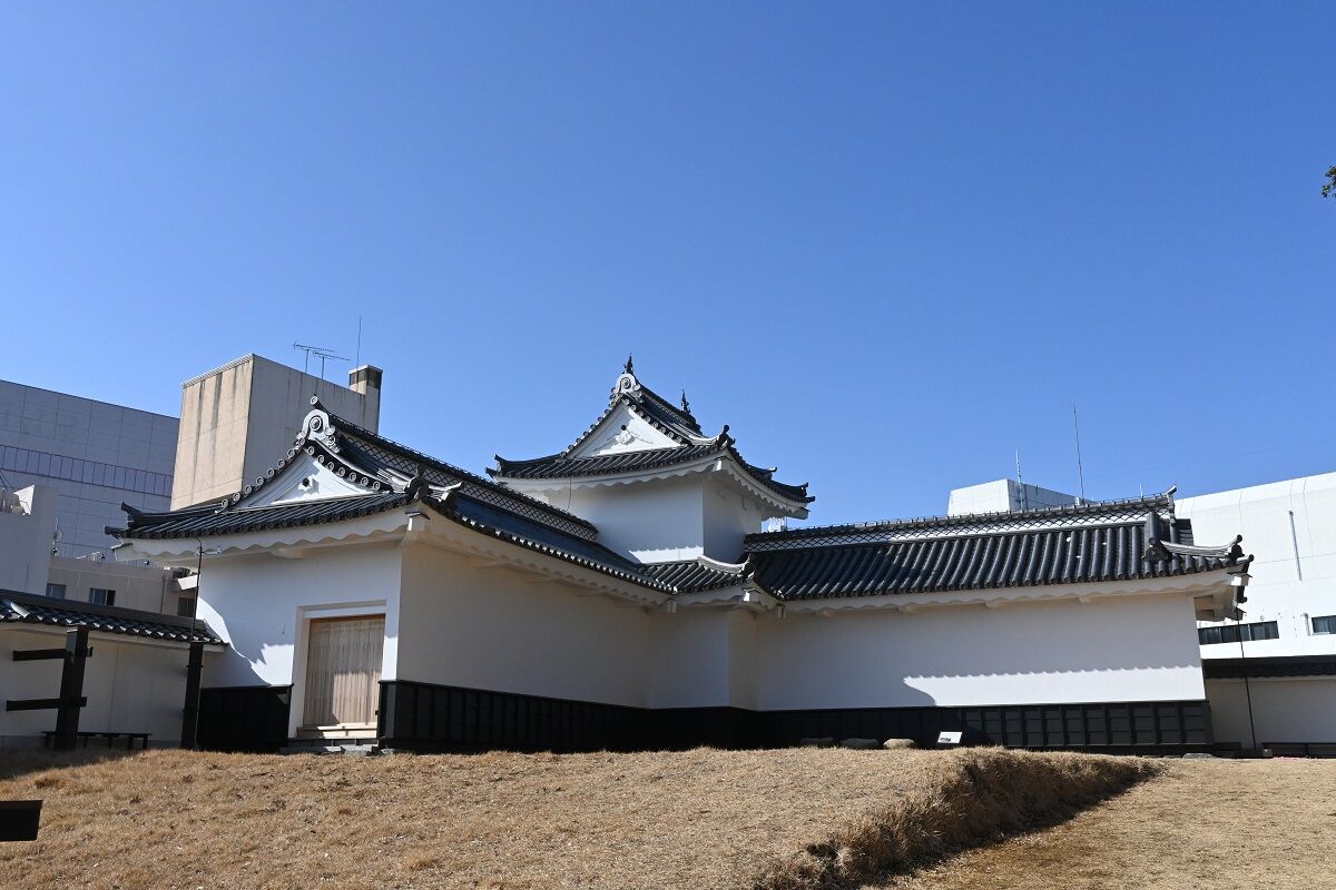 二の丸角櫓は水戸城内に存在していた角櫓のひとつで,二の丸の南西部角に位置していました。櫓本体は2階建の角櫓とその北側・東側に接続される2つの多聞櫓(=北多聞櫓・東多聞櫓)から構成されていて,L字型をしています。 かつて,城内には4基の角櫓が建てられていて,城の北側よりも南側(城下町側)にかたよって設けられていたことから、城下から城を見上げた際の視線を意識してつくられたと考えられています。