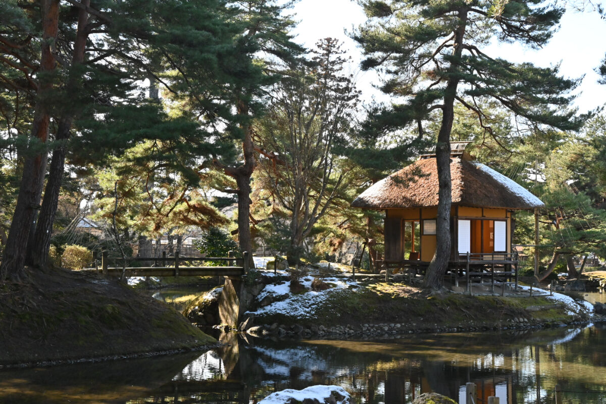 周囲約540メートルの長方形で面積は1.7ヘクタール,約5100坪あり,北に千古の雪を頂く飯豊の霊峰や,東には磐梯の秀峰と背あぶり山・東山の連山が望まれた借景のすばらしい庭園として造られました。