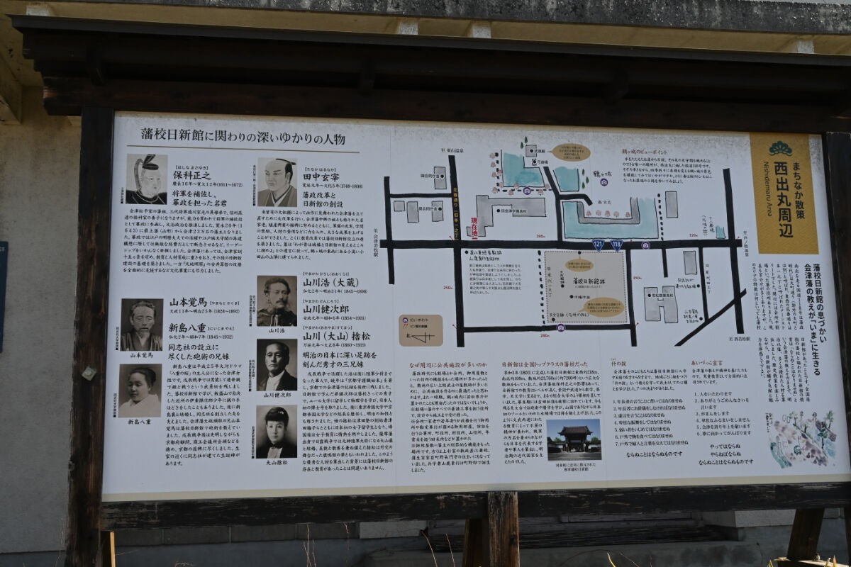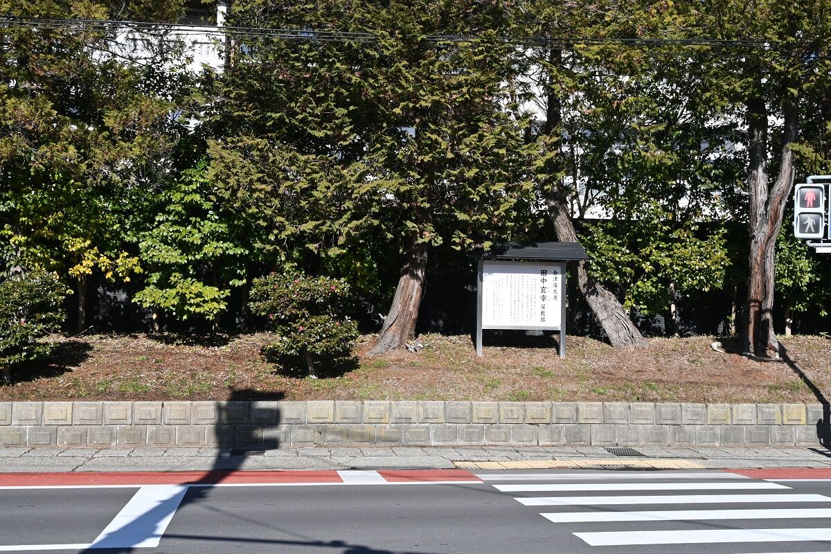 御薬園へ行く途中で見つけたのが,田中玄宰(たなかはるなか)の屋敷跡でした。田中玄宰は江戸時代後期の会津藩家老で,会津藩5代藩主・松平容頌(かたのぶ),6代藩主・松平容住(かたおき),7代藩主・松平容衆(かたひろ)に仕えた偉い人です。天明の大飢饉の窮地を乗り越えるため,殖産興業の奨励を図り,今日の会津地方の伝統産業の基礎を築くなど,高く評価されたそうです。