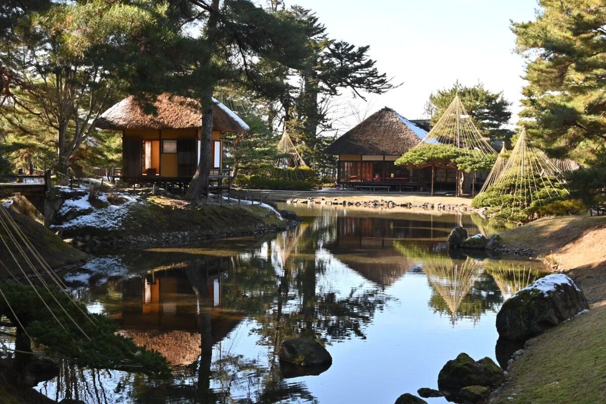 現在の庭園は3代藩主・松平正容(まさかた)の時代,1696年(元禄9年)に小堀遠州の流れを汲む園匠目黒浄定(めぐろじょうてい)と普請奉行辰野源左衛門(たつのげんざえもん)の手に成るもので,規模を拡大し借景を取り入れた池泉回遊式の大名庭に大補修を加えたものです。
