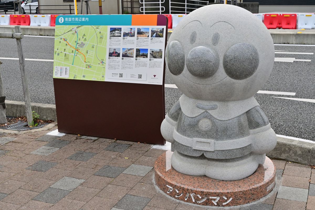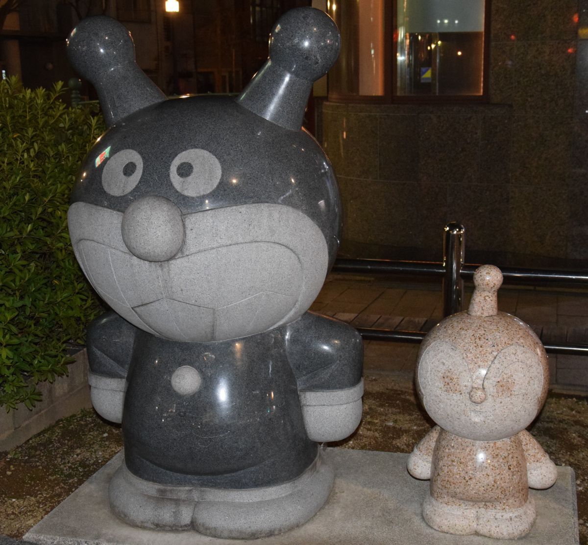 詩碑の左側にはアンパンマン,右側にはばいきんまんの石像が建てられています。石像が斜めを向いているのは「アンパンマンミュージアム」を見守るように建てられたからだそうです。