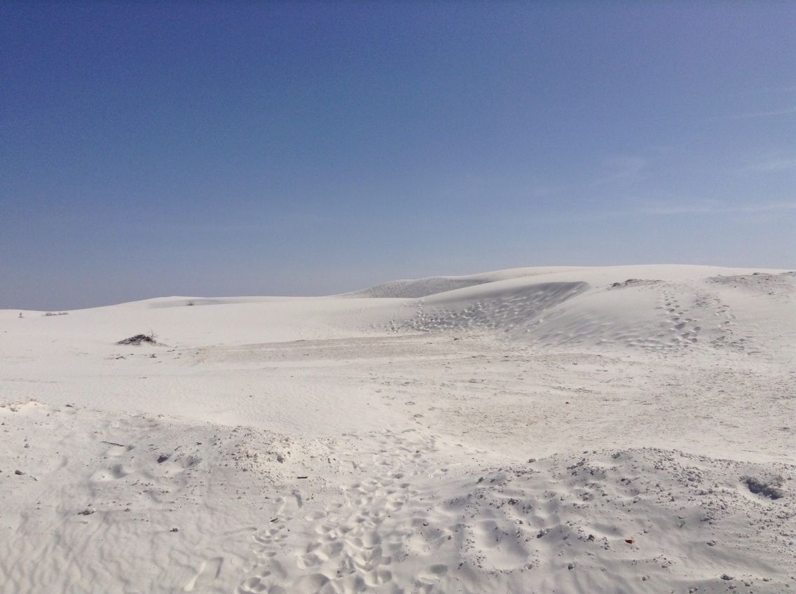 次に行ったのがホワイトサンズ国定公園でした。カールズバッドから車で4時間かかりました。ここは琵琶湖よりも広い区域が全面純白の砂に覆われているところで,夕景はまさに絶品でした。行ったことはないのですが,きっと,サハラ砂漠も色だけは違いますがこういう感じなんだろうと思いました。