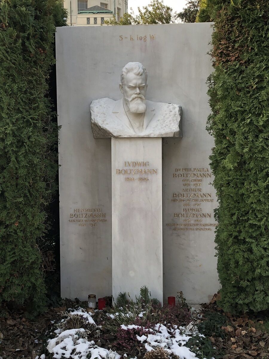 今日の最後の写真は,私が写したウィーン中央墓地にあるボルツマン(Ludwig Eduard Boltzmann)の墓。ボルツマンはオーストリアの物理学者で,エントロピーの増大は分子運動の確率的性質によることを明らかにし,エントロピーを状態確率の関数として表しました。ボツルマンの墓には,エントロピーのミクロな定義を与え統計力学の基礎を確立した公式「S = k log W」 が刻まれています。