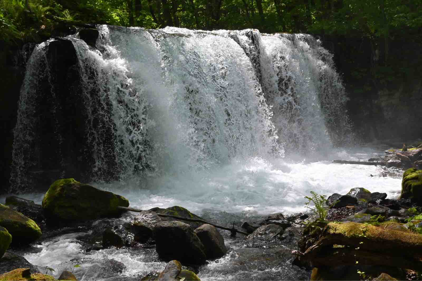 奥入瀬渓流本流にかかる随一の滝が銚子大滝です。高さ7メートル,幅20メートルある堂々たる滝です。流れ落ちる水は多量の水霧を生み,木漏れ日がそこに幾本もの光の筋を作っていました。滝の右手に伸びる断層や左から流れ込む寒沢の影響でできたこの滝は,十和田湖への魚の遡上を妨ぐので,魚止の滝ともよばれ,長い間,十和田湖には魚が住めないといわれてきました。