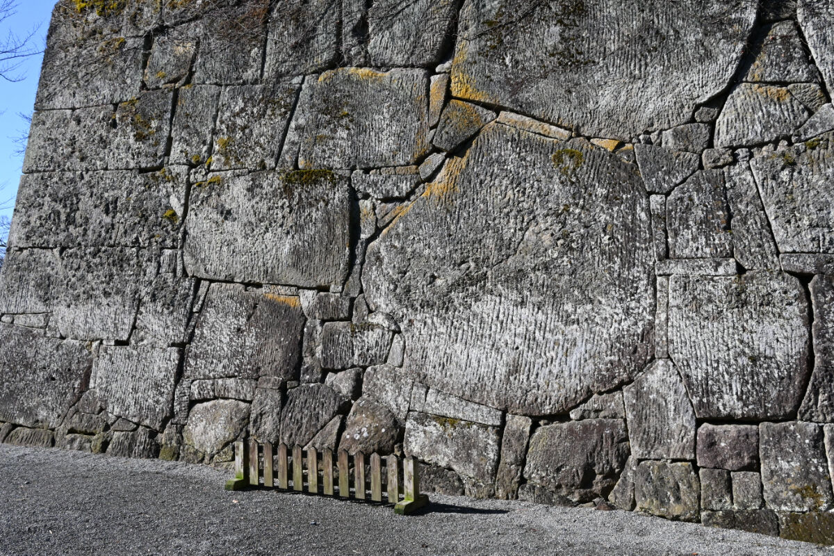 鶴ヶ城で目につくのは石垣です。石垣の加工は時代の流れとともに進化しました。鎌倉後期の自然石をそのまま積み上げる野面積みはじまりました。関ケ原の合戦以降盛んに用いられたのは表面に出る石の角や面をたたき平たくする打込み接ぎ,江戸時代初期から多用された方形に整形した切込み接ぎです。鶴ヶ城は,それぞれの時代の石垣の変遷をみることができます。