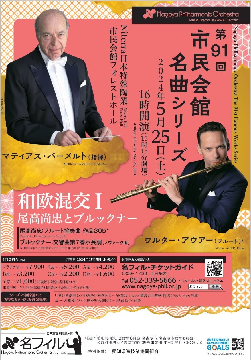 曲目は, ワルター・アウアーさんがフルートを演奏する尾高尚忠のフルート協奏曲とブルックナーの交響曲第7番でした。フルート協奏曲は第2楽章がきわめて日本らしい音階ですてきでした。
