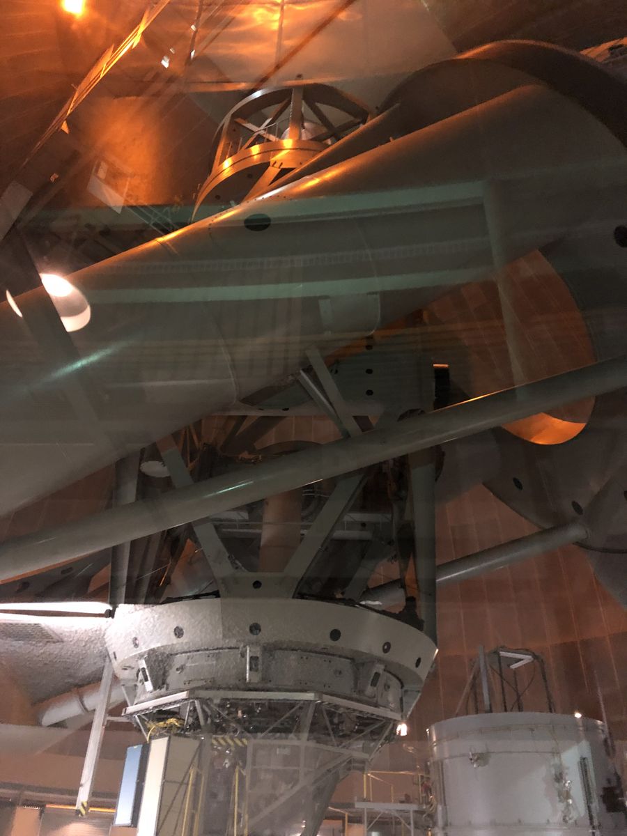 見学ツアーでは,まず,ドームの入口の前で望遠鏡の歴史のレクチャーがあってから,いよいよドームに入ります。ドームの1階部分では反射鏡の再メッキができる工場があって,それらの装置の説明ののち,端にある階段を上って,ついに,望遠鏡のある2階に登り,巨大望遠鏡と対面となります。