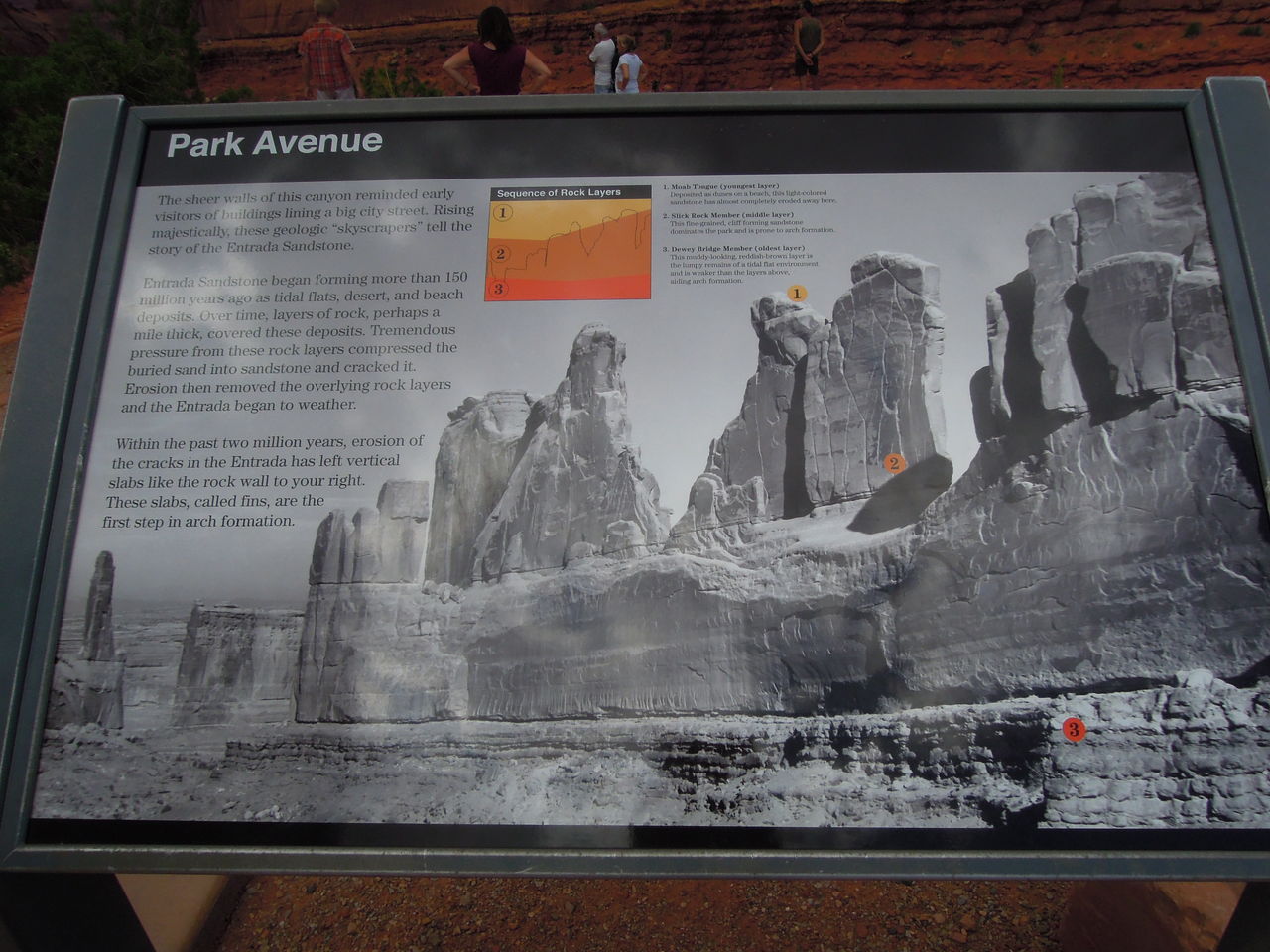 アーチーズ国立公園は世界で一番たくさんのアーチ,というか,穴の開いた岩が集まっているところです。今から約4,000万年前の地殻変動でこの地方一帯の土壌が隆起して,コロラド川やグリーン川による浸食がはじまりました。上部の層は浸食され,塩の背斜構造が地表近くに露出し,水が塩の層を溶かし,支えを失って谷や割れ目が生じました。