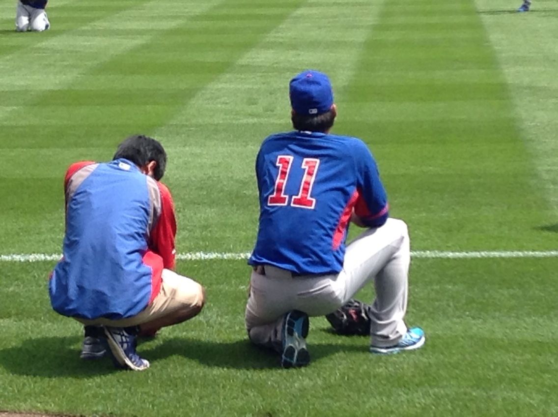 試合前の練習で,相手チームのカブスの藤川投手をみつけ声をかけました。